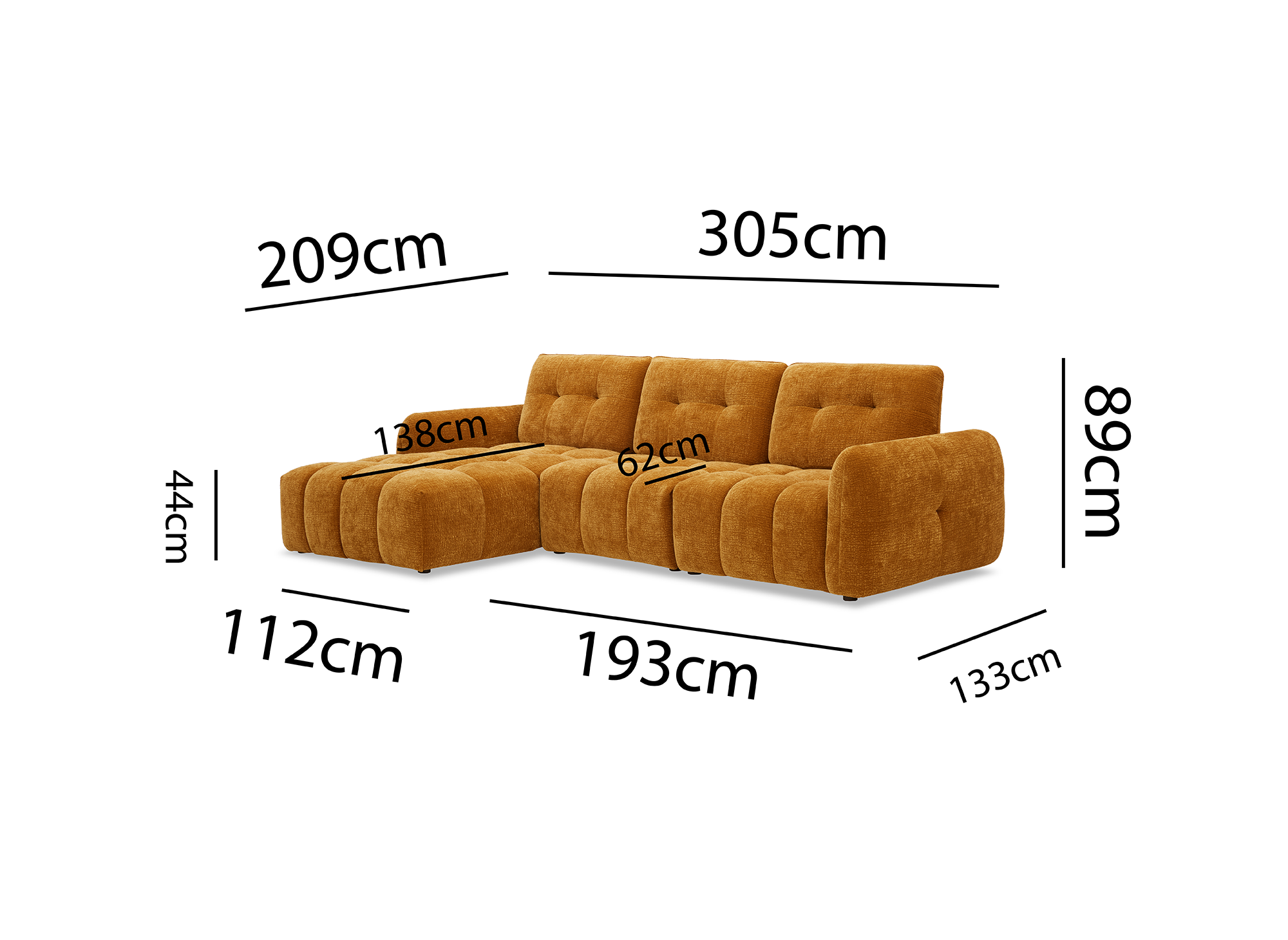 Le canapé d’angle ADONIS est un canapé d’angle moderne conçu pour offrir un bon confort d’assise et une flexibilité d’utilisation. Son revêtement en velours tissé moutarde apporte une texture agréable au toucher et s’intègre facilement dans un salon contemporain ou plus classique.