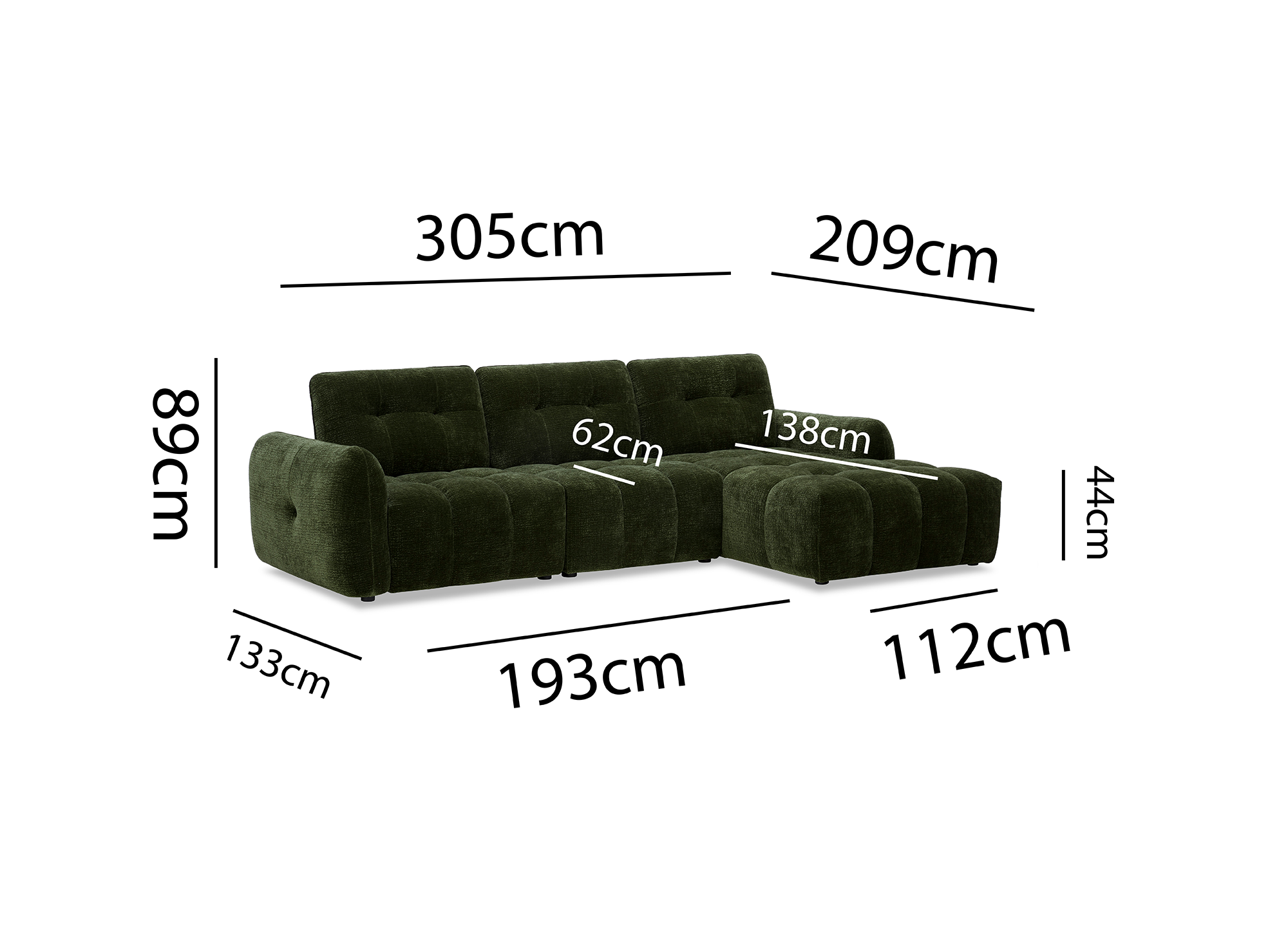 Le canapé d’angle ADONIS est un canapé d’angle moderne conçu pour offrir un bon confort d’assise et une flexibilité d’utilisation. Son revêtement en velours tissé vert olive apporte une texture agréable au toucher et s’intègre facilement dans un salon contemporain ou plus classique.