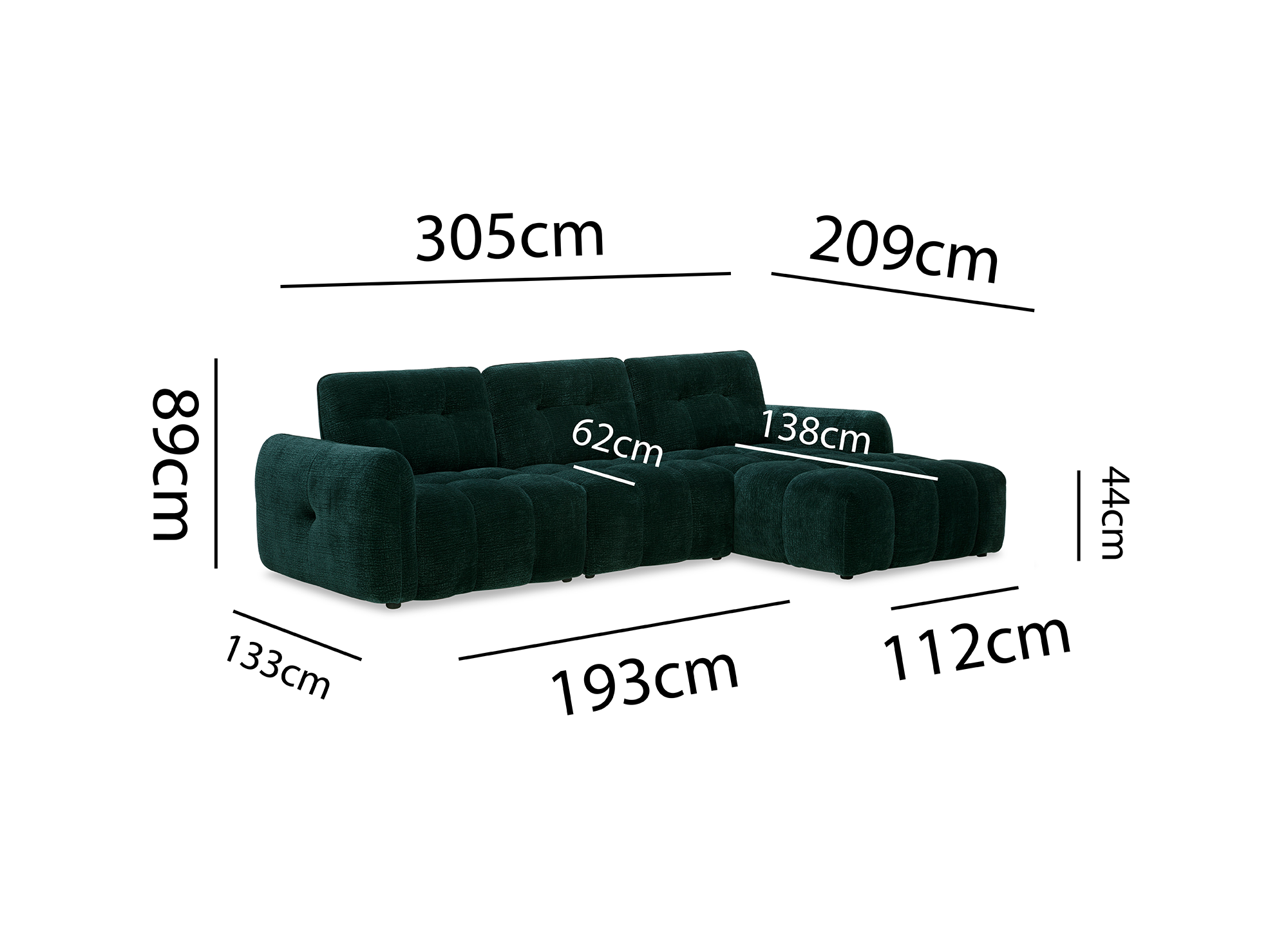 Le canapé d’angle ADONIS est un canapé d’angle moderne conçu pour offrir un bon confort d’assise et une flexibilité d’utilisation. Son revêtement en velours tissé vert sapin apporte une texture agréable au toucher et s’intègre facilement dans un salon contemporain ou plus classique.