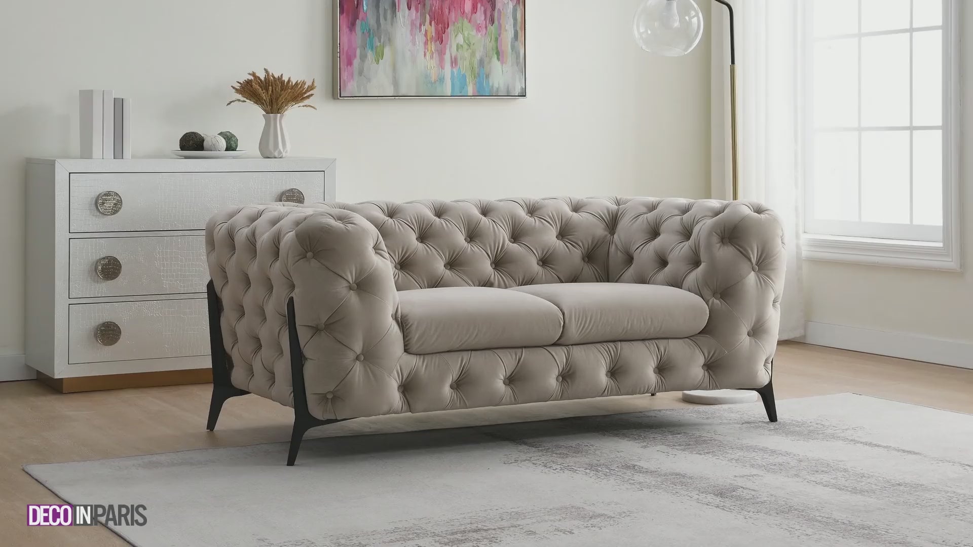 Descubre la combinación perfecta del estilo mítico e intemporal del sofá Chesterfield con la modernidad del metal negro en nuestro sofá capitoné de 2 plazas CARMEN en terciopelo beige.