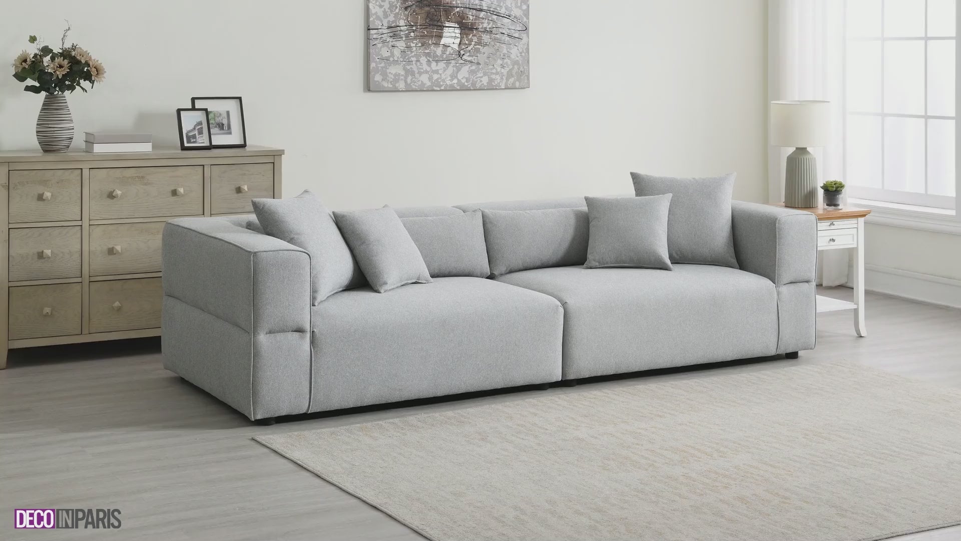 Para crear un ambiente de relajación y convivencia, elige el sofá EVELYNE de 4 plazas tapizado en tela gris.