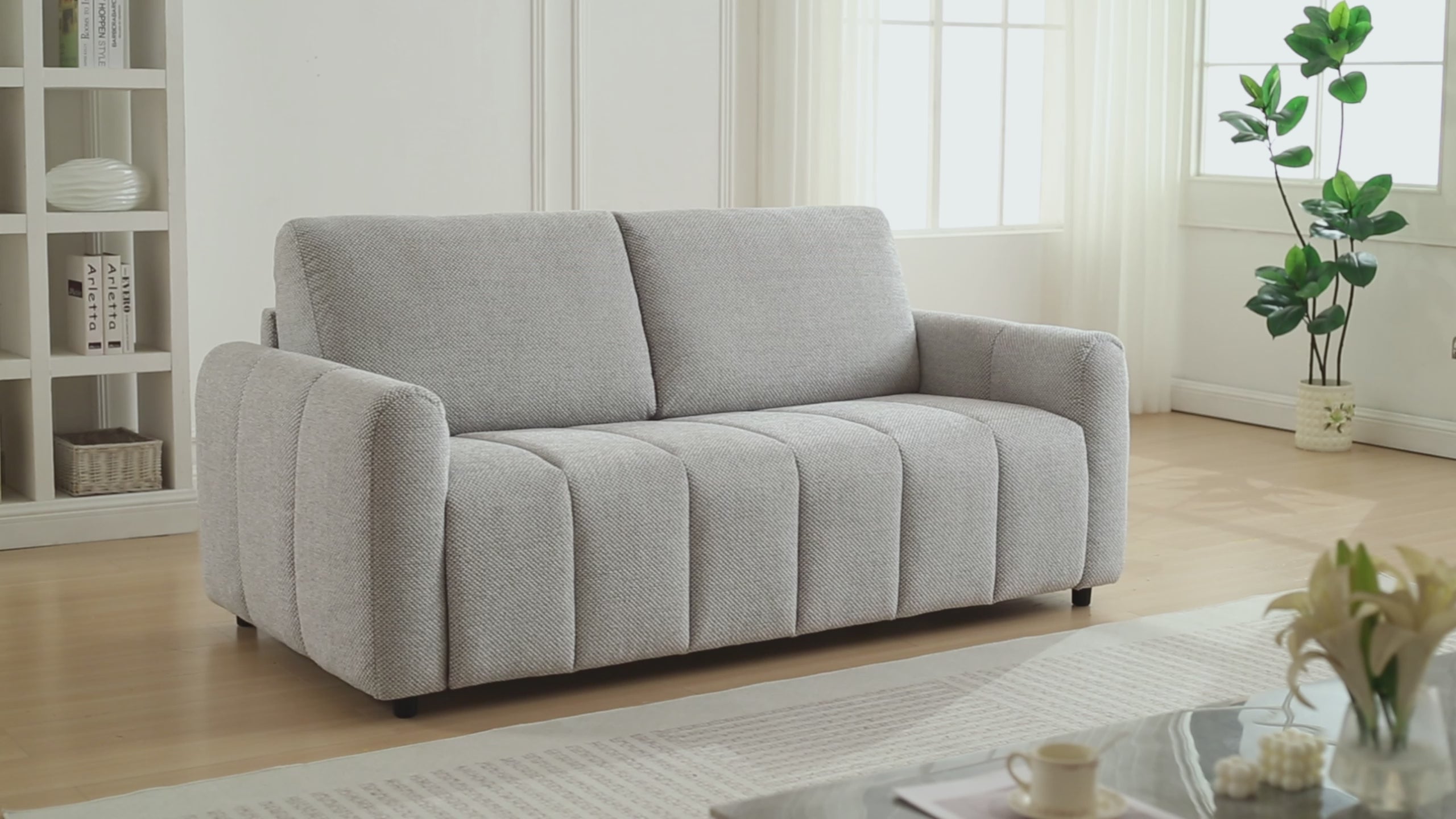 Con su diseño estructurado y silueta acogedora, el sofá cama ISANDRO se convierte en una pieza central que realza cualquier salón a la vez que ofrece una cama confortable. Su tapizado en tela gris de tacto suave y los detalles de costuras verticales le confieren un aspecto moderno y a la vez acogedor.