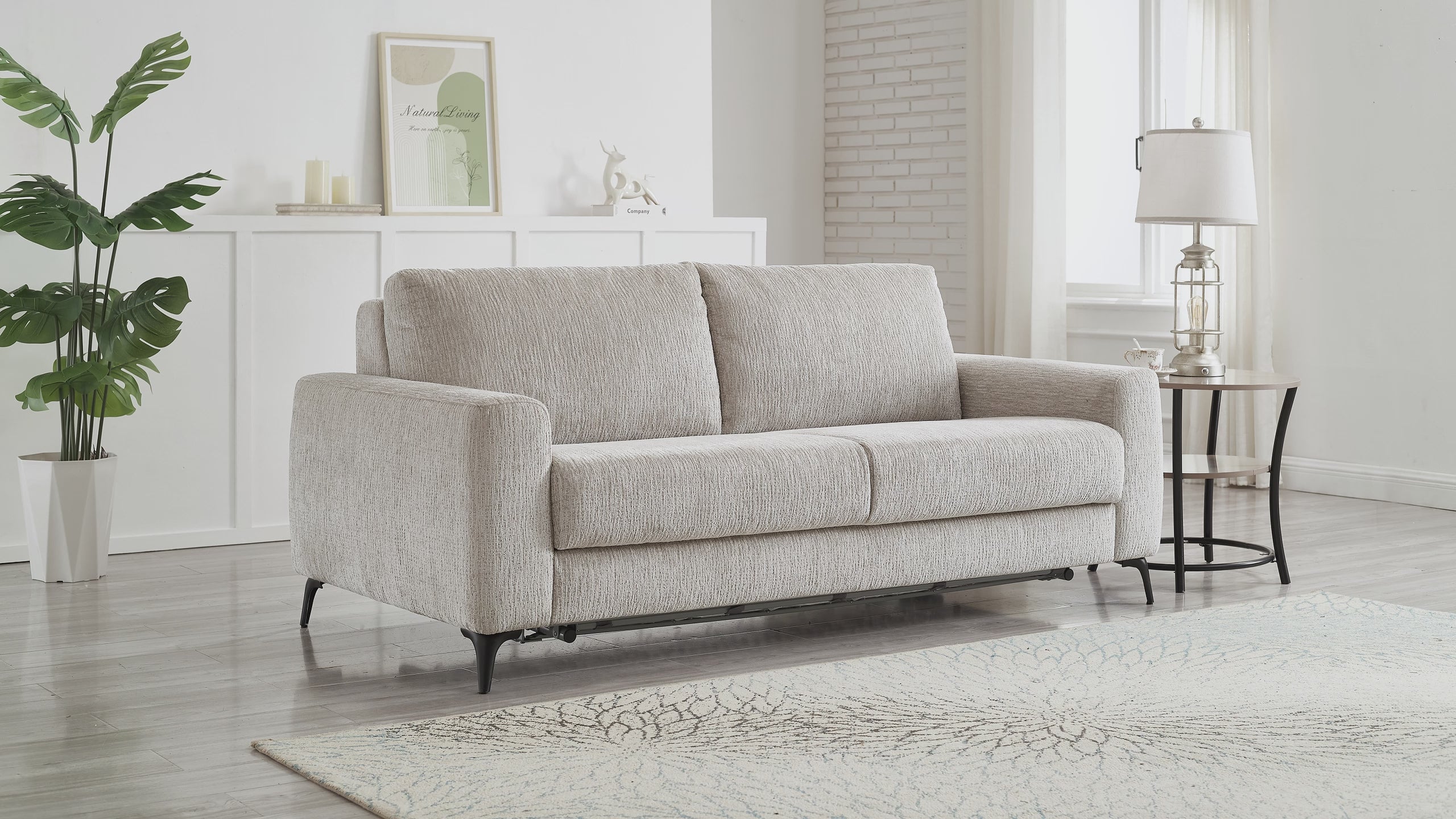 El sofá cama NONA es la combinación perfecta de elegancia moderna y funcionalidad para el día a día. Su diseño refinado, con líneas suaves y altas patas de metal negro, aporta un toque ligero y contemporáneo a tu hogar.