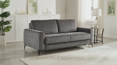 El sofá cama NONA es la combinación perfecta de elegancia moderna y funcionalidad para el día a día. Su diseño refinado, con líneas suaves y altas patas de metal negro, aporta un toque ligero y contemporáneo a tu hogar.