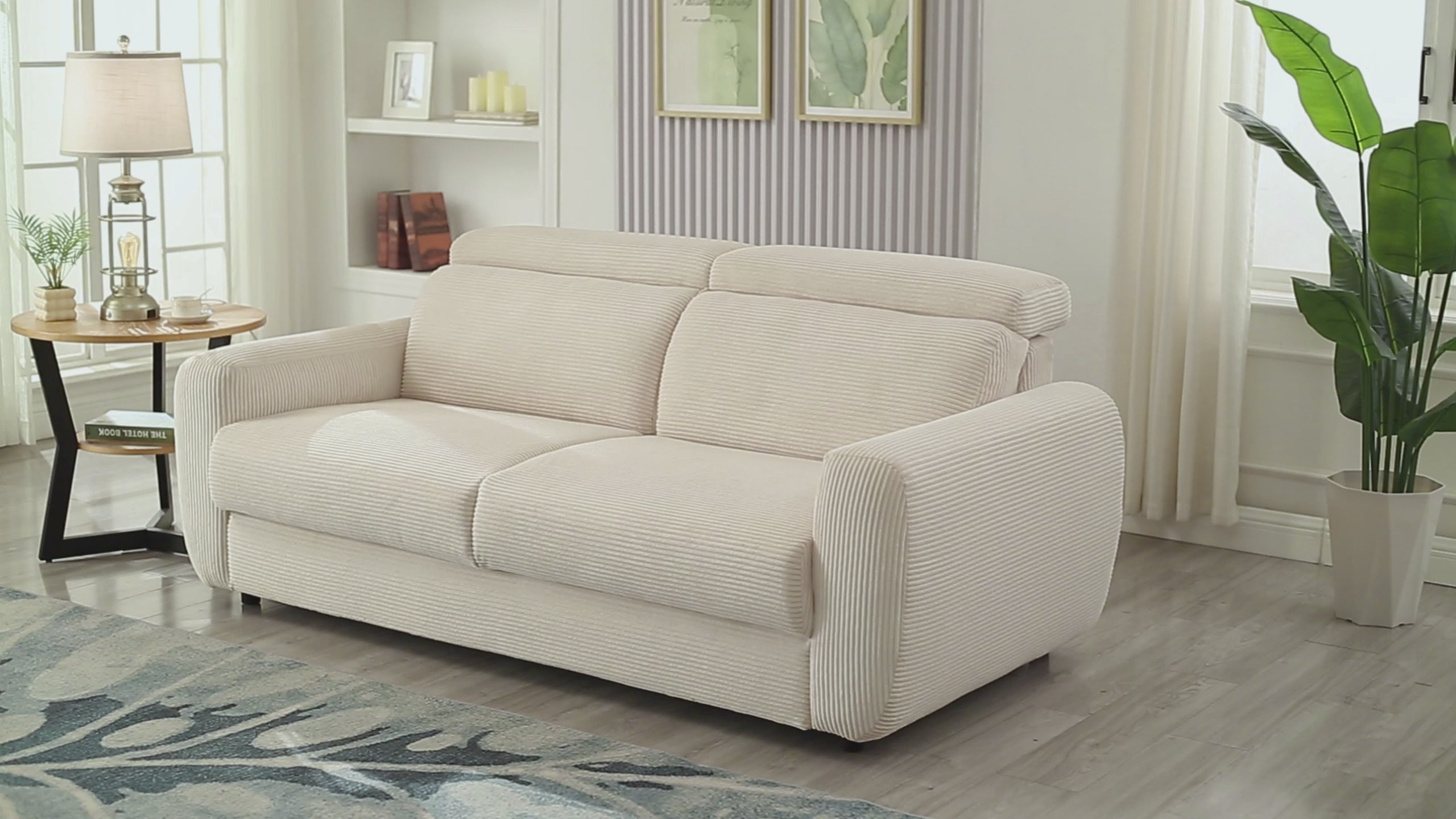 Su suave y cálida tapicería de pana color beige proporciona una sensación acogedora y se integra a la perfección tanto en decoraciones contemporáneas como clásicas. Los reposacabezas ajustables ofrecen una sujeción óptima para la cabeza y el cuello, ya sea para leer, ver la televisión o simplemente relajarse.