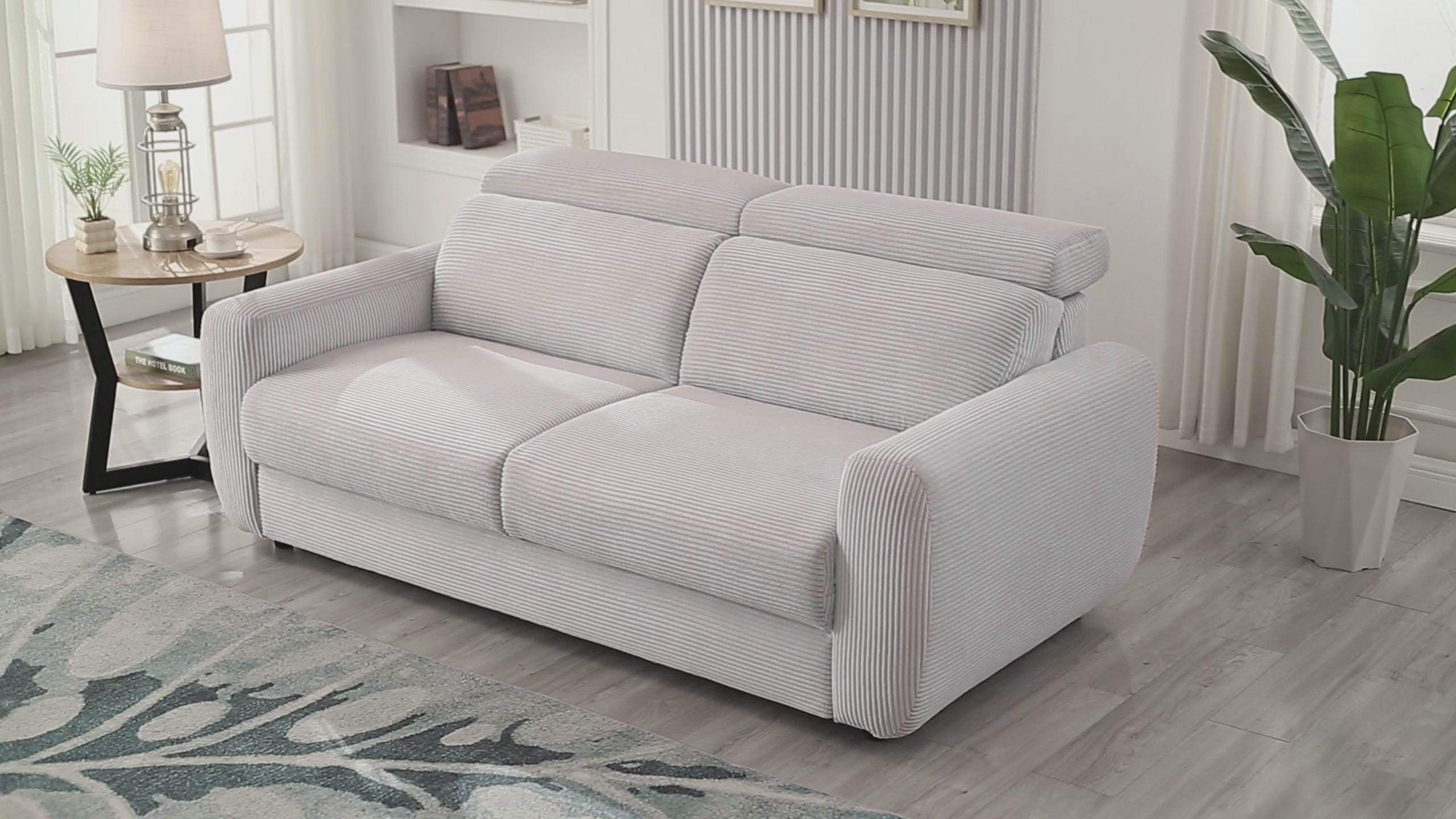 Su suave y cálida tapicería de pana gris proporciona una sensación acogedora y se integra a la perfección tanto en decoraciones contemporáneas como clásicas. Los reposacabezas ajustables ofrecen una sujeción óptima para la cabeza y el cuello, ya sea para leer, ver la televisión o simplemente relajarse.