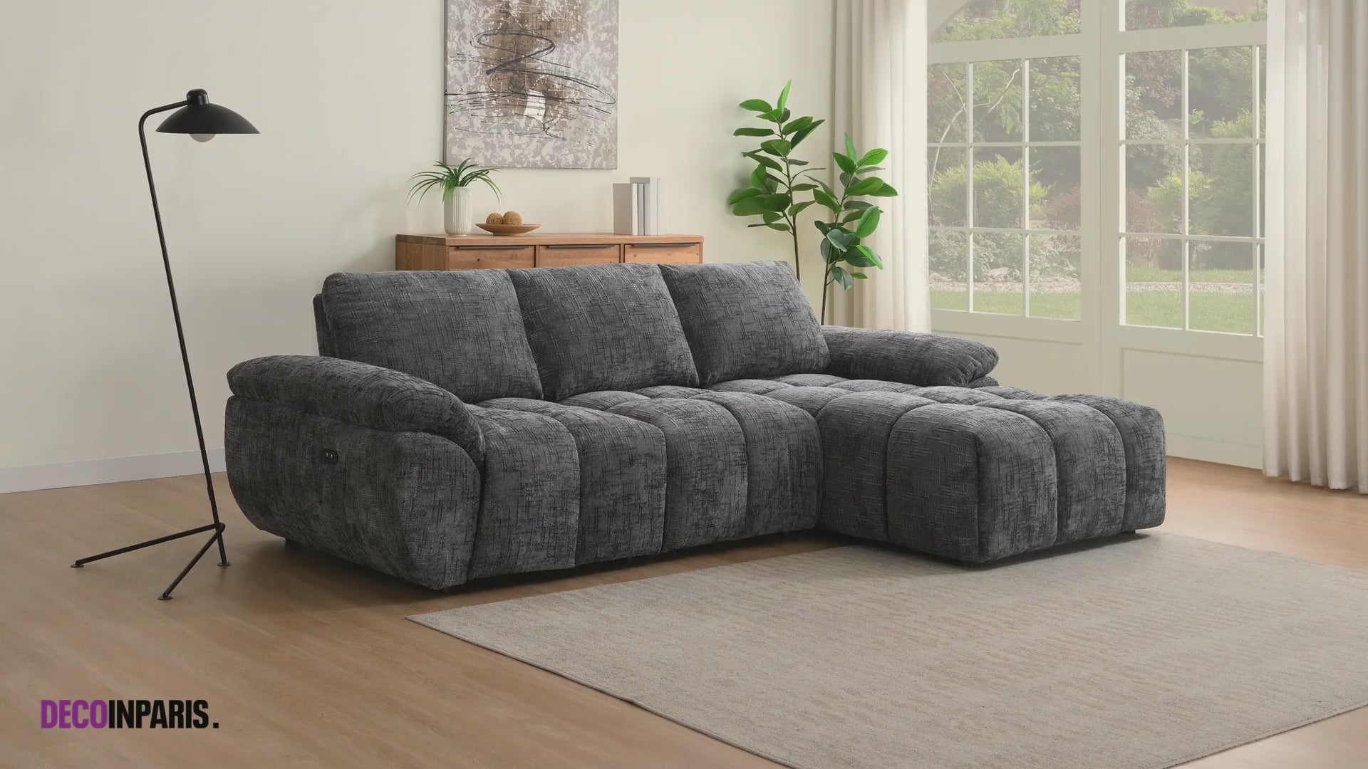El sofá esquinero reclinable eléctrico ALPES, tapizado en terciopelo gris jaspeado, combina con elegancia comodidad y diseño contemporáneo. Gracias a su amplio asiento, sus formas redondeadas y su tapizado de terciopelo jaspeado texturizado, aporta un toque cálido, moderno y refinado a su salón.