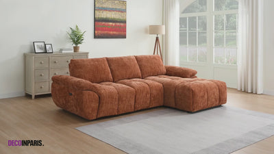 El sofá esquinero reclinable eléctrico ALPES, tapizado en terciopelo jaspeado color terracota, combina con elegancia comodidad y diseño contemporáneo. Gracias a su amplio asiento, sus formas redondeadas y su tapizado de terciopelo jaspeado texturizado, aporta un toque cálido, moderno y refinado a su salón.