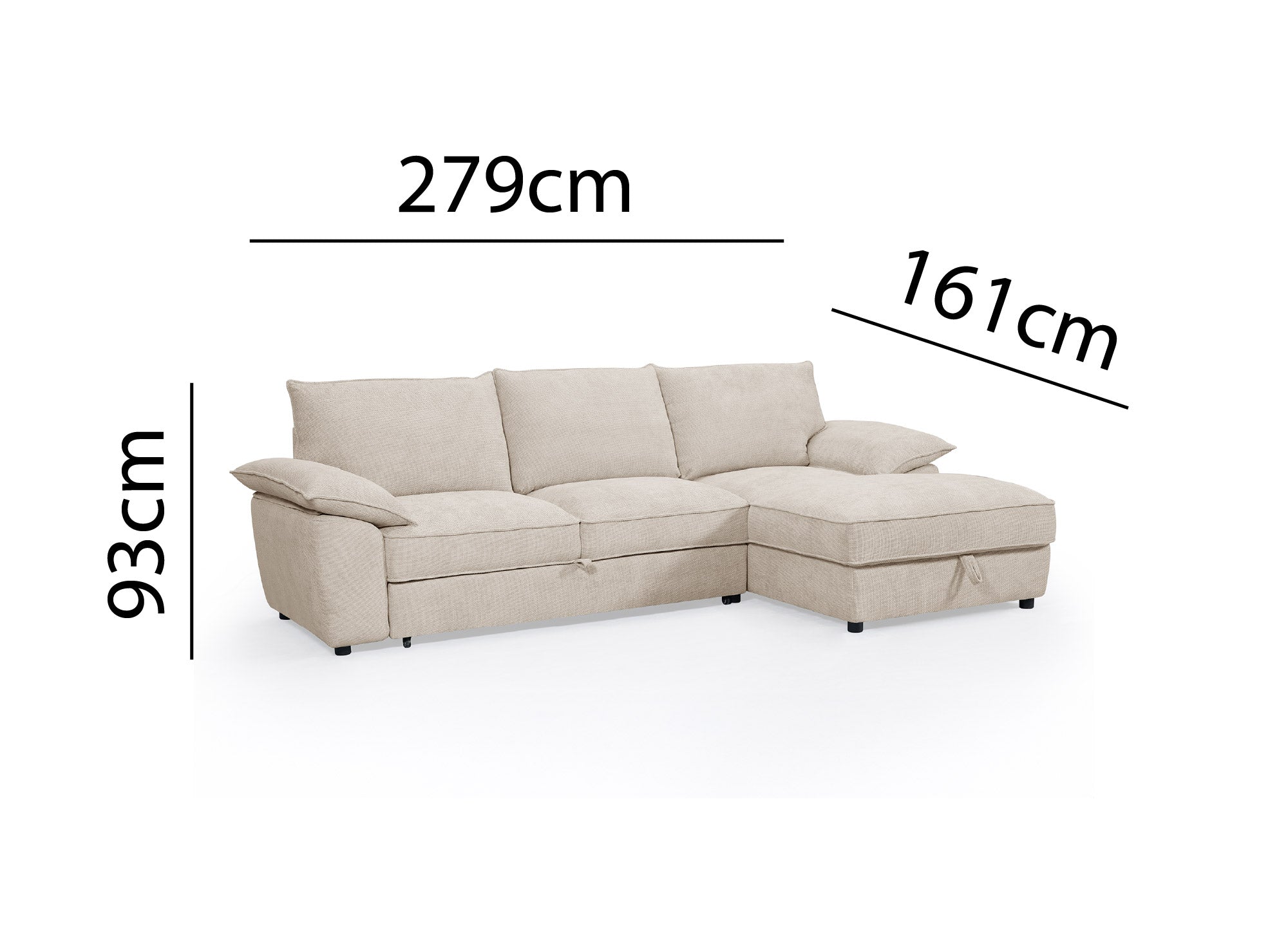 ¿Su ventaja adicional? Un discreto compartimento de almacenamiento integrado bajo el asiento, ideal para guardar mantas, cojines u otros accesorios, lo que te permite aprovechar al máximo el espacio sin renunciar al estilo. El sofá se convierte fácilmente en cama, ofreciendo una solución práctica para tus invitados.
