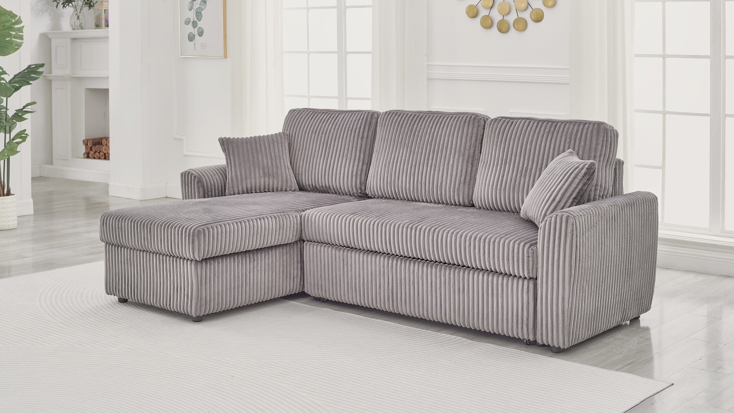 Descubre el sofá esquinero convertible y reversible ADRYEN en pana gris gruesa, una pieza central con un diseño limpio, perfecta para realzar tu sala de estar.