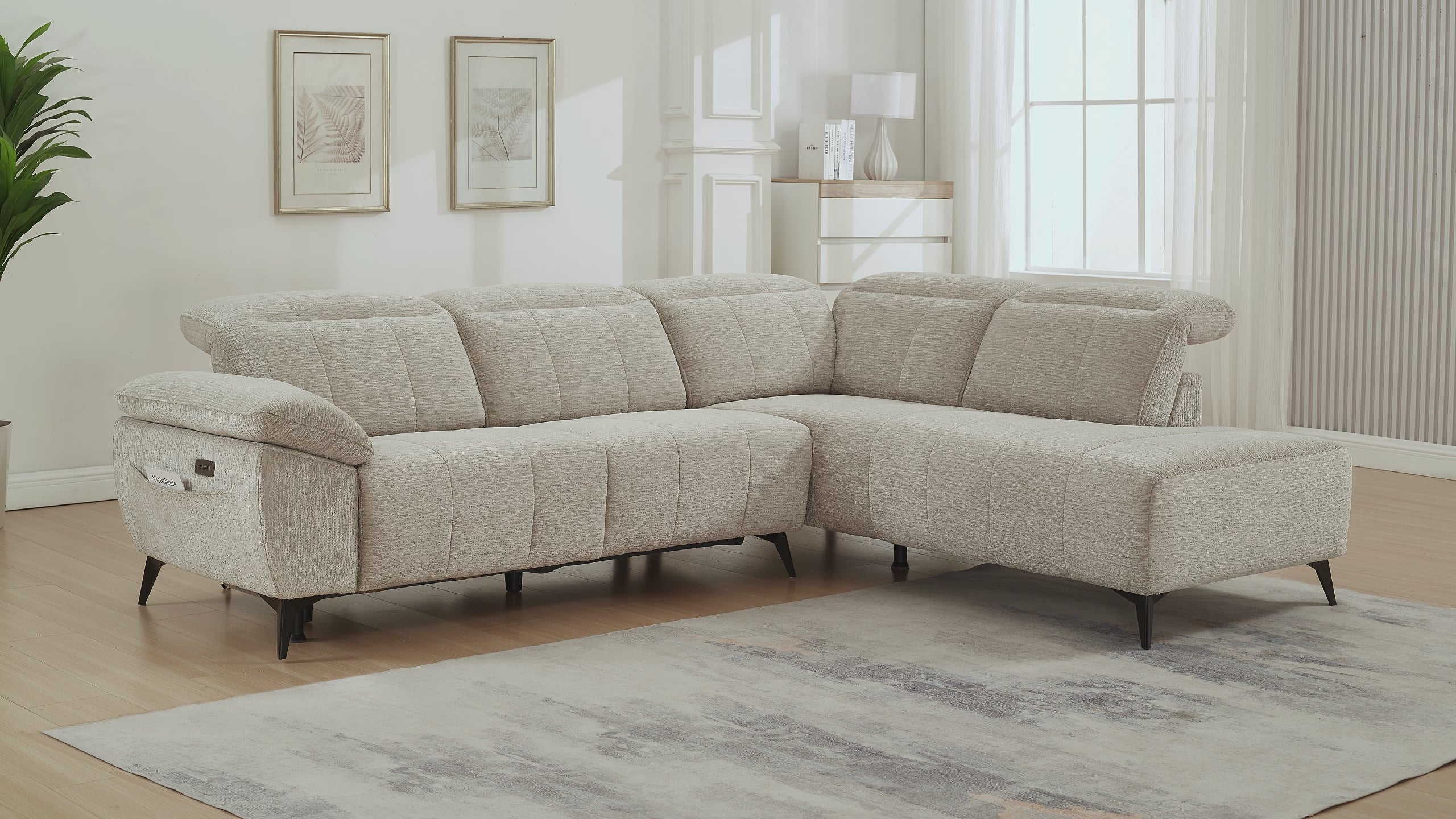 Sofá esquinero reclinable eléctrico SOLINA en terciopelo jaspeado beige - Esquinero derecho