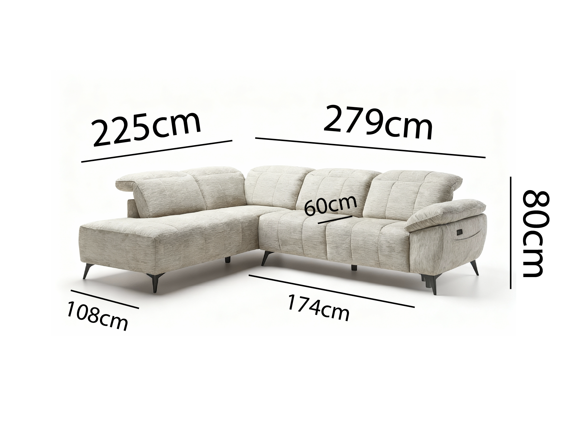 Con su diseño moderno y su confort superior, el sofá esquinero reclinable eléctrico SOLINA en terciopelo beige jaspeado invita a la relajación. Perfecto para salones amplios, combina una estética refinada con características bien pensadas para el uso diario.