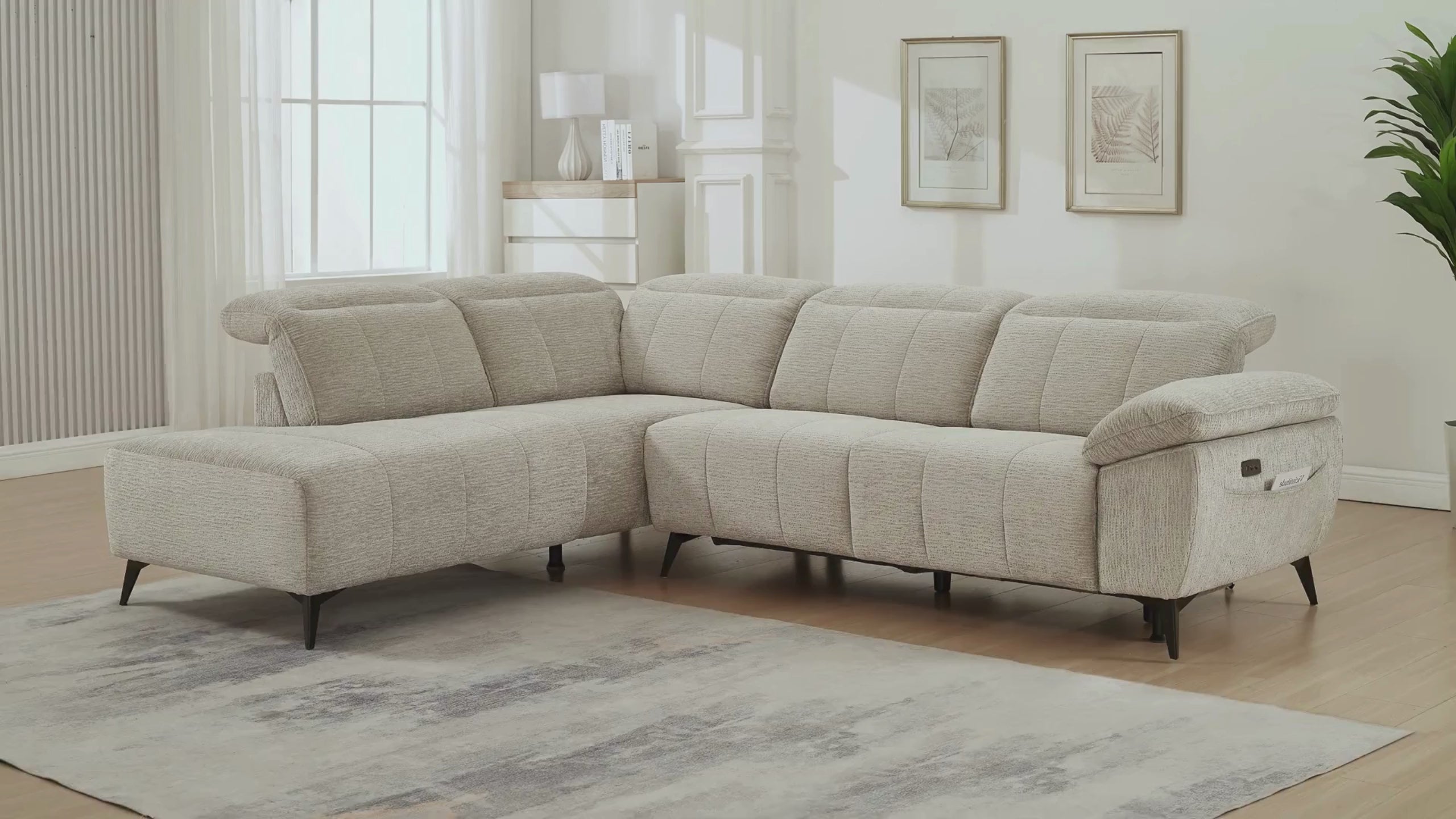 Sofá esquinero eléctrico reclinable SOLINA en terciopelo jaspeado beige - Esquina izquierda