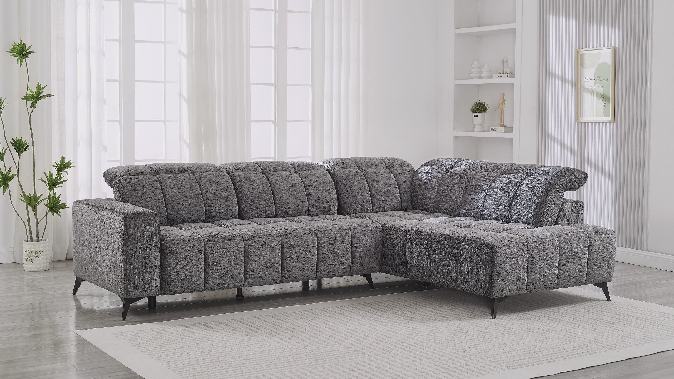 Diseñado para combinar diseño contemporáneo y bienestar cotidiano, el sofá esquinero ALVAR en terciopelo gris jaspeado transforma su sala de estar en un verdadero oasis de confort.