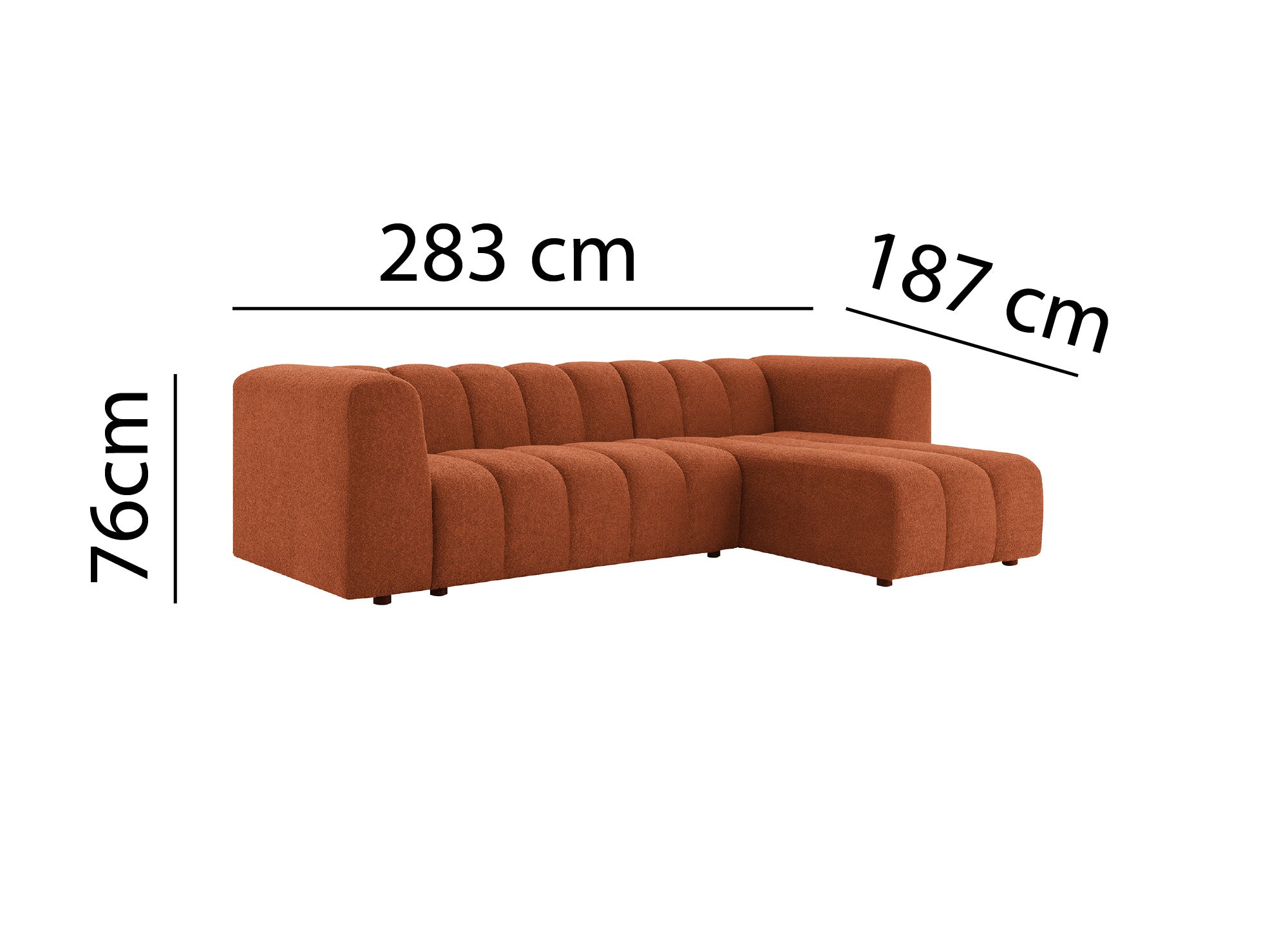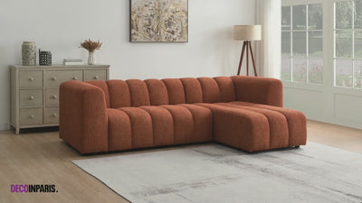 Transforma tu salón con el sofá esquinero reversible AELIS en tela bouclé color terracota , un sofá de diseño elegante, funcional y sumamente cómodo. Ideal para salones de estilo contemporáneo, escandinavo o minimalista, este sofá esquinero reversible en tela bouclé encarna el equilibrio perfecto entre una estética refinada y la comodidad del día a día.
