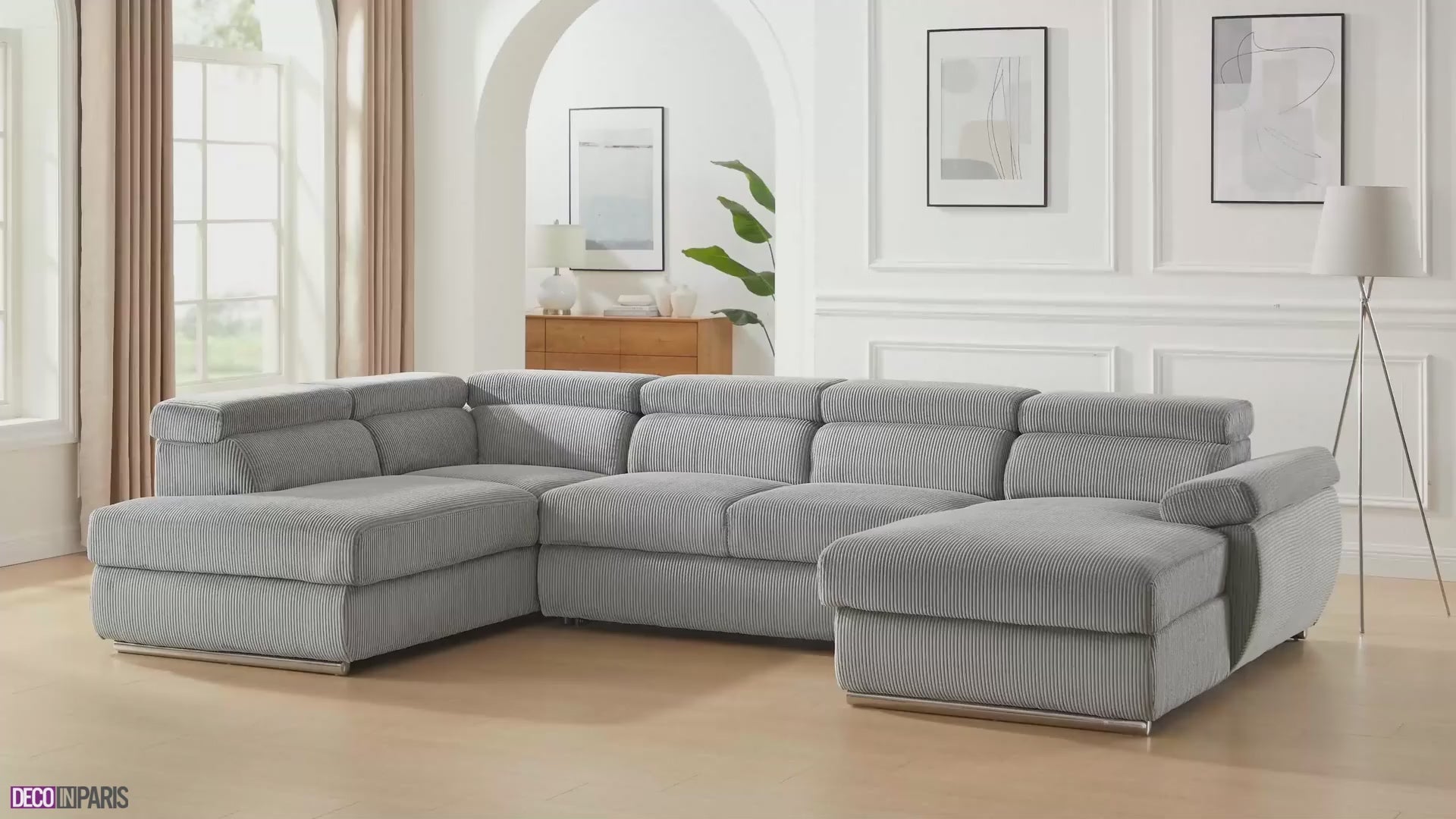 Gracias a su elegante diseño, el sofá cama esquinero MARIANO se adapta a cualquier interior. Su estilo decididamente contemporáneo, combinado con su moderna tapicería de pana gruesa, crea un espacio de sofisticación discreta. Sus generosas curvas redondeadas y las refinadas patas de metal cromado plateado aportarán un toque de encanto y autenticidad a tu salón.