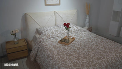Su suave y texturizado tejido de bucle beige que la recubre añade una dimensión acogedora y cálida que realzará tu espacio para dormir.