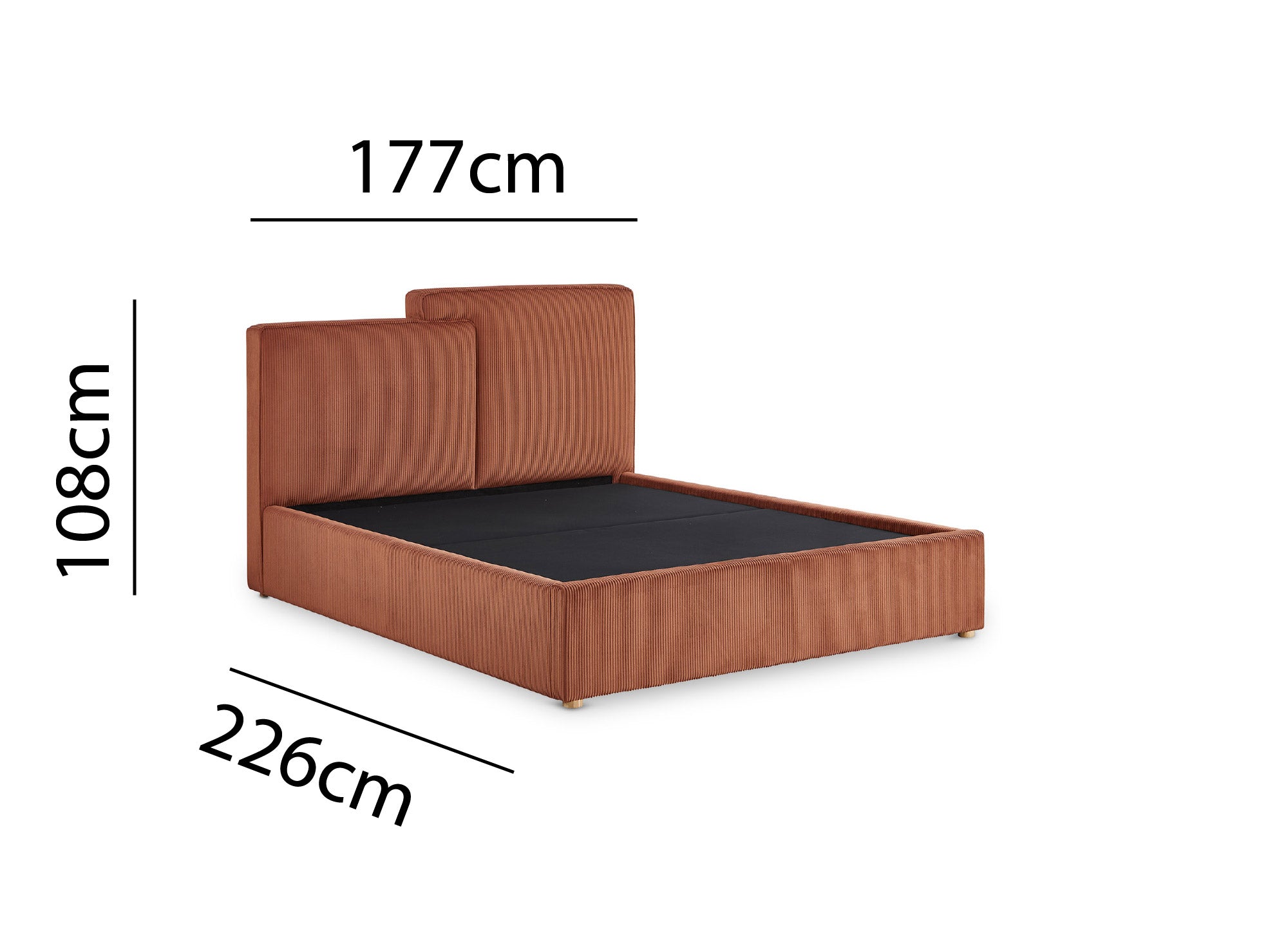 Tapizada en suave pana texturizada de color terracota, esta cama combina armoniosamente con cualquier tipo de decoración interior.