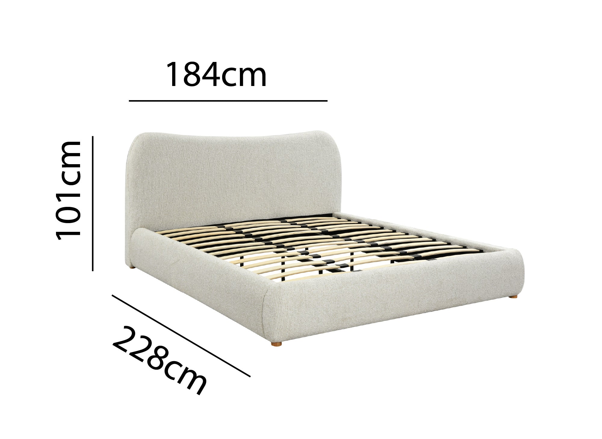 Su color blanco roto invita a relajarse y disfrutar de noches cálidas y tranquilas. El cabecero de forma singular le da un toque elegante a la cama. El tejido con efecto piel de oveja crea un espacio acogedor y refinado que combinará fácilmente con su decoración actual.