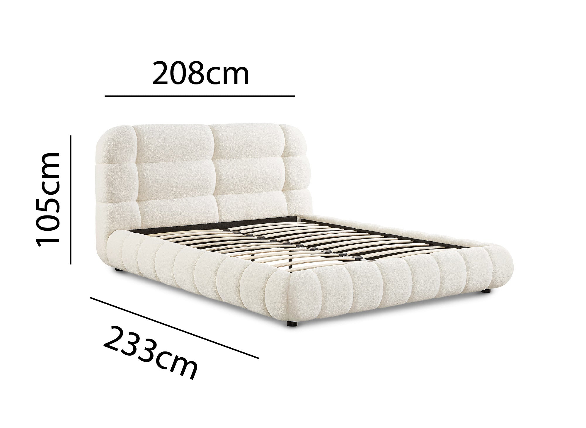 Transforma tu dormitorio en un remanso de paz y estilo con la cama YOURI de tela bouclé color crudo, una elección perfecta para quienes buscan combinar un diseño sofisticado con la máxima comodidad.