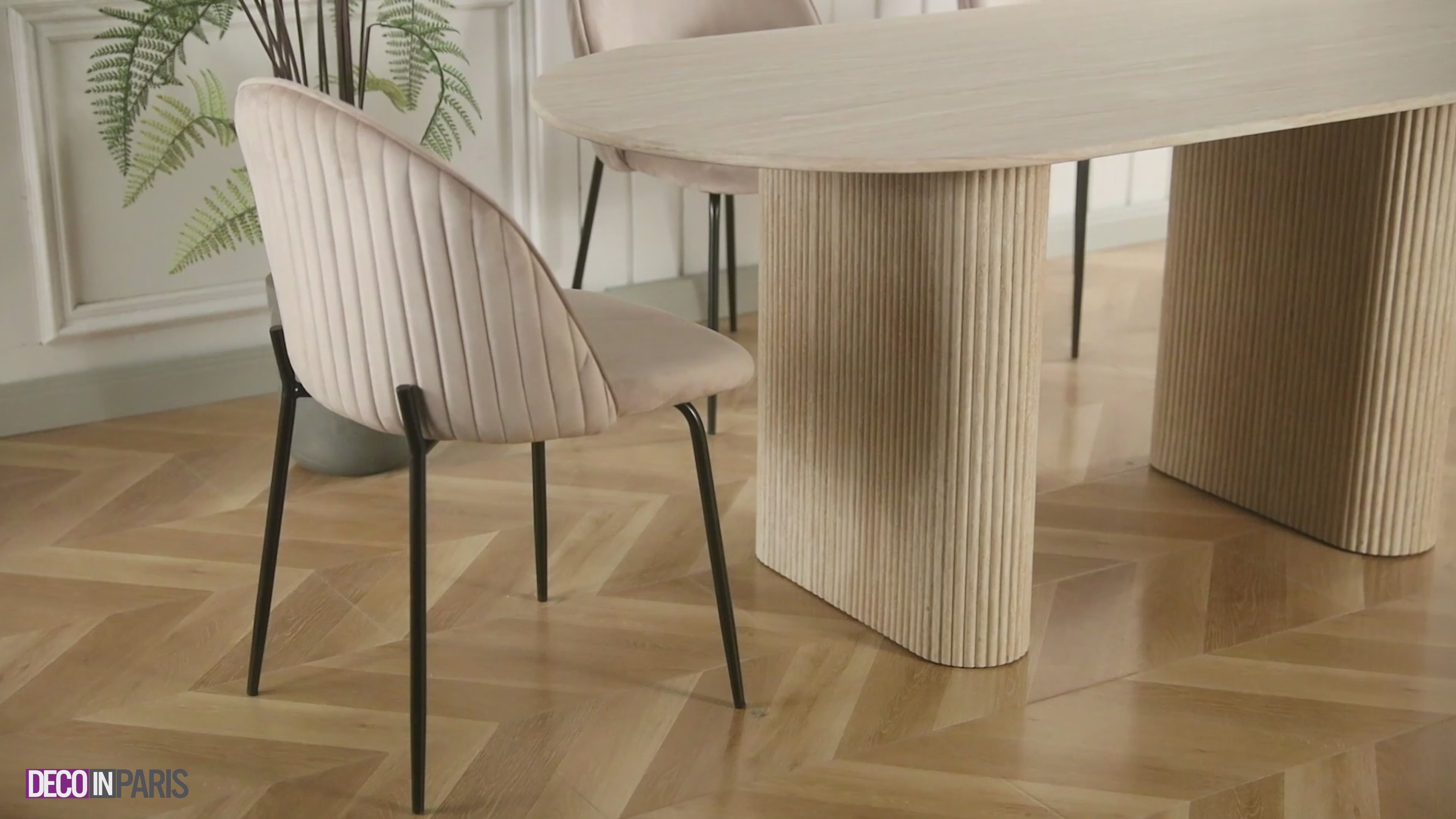Con su estilo retro chic y su aspecto vintage, la silla ARABEL de terciopelo beige se adapta tanto a decoraciones de interiores modernas como clásicas.