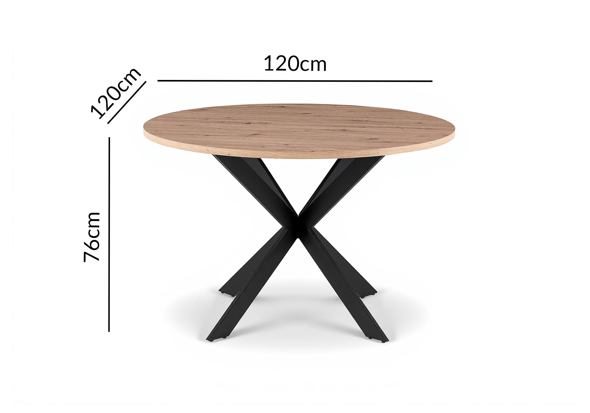Mesa de comedor redonda SINAYA con tablero efecto madera y patas de metal negro.