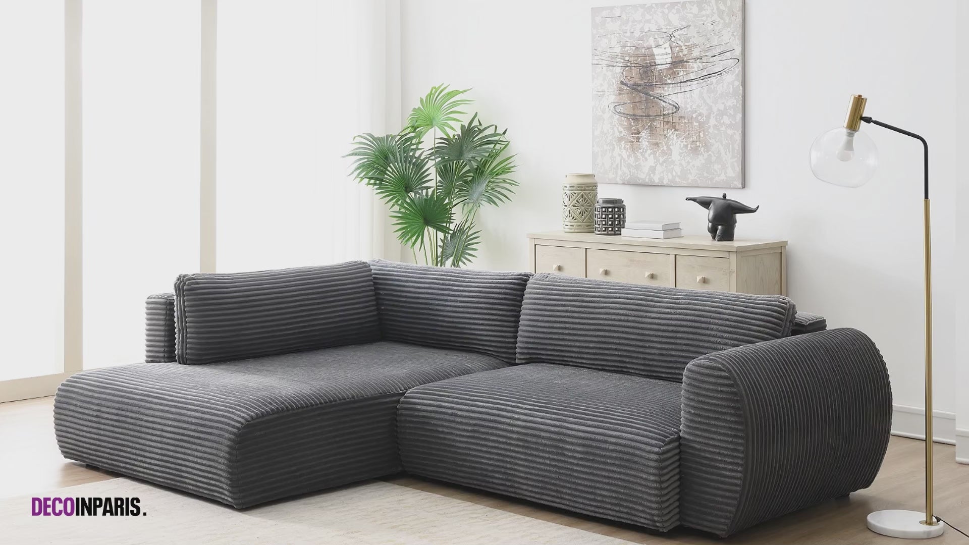 El sofá esquinero convertible TILDA en pana gris es, por lo tanto, la combinación perfecta de comodidad, elegancia y practicidad, transformando su sala de estar en un espacio acogedor y sofisticado.
