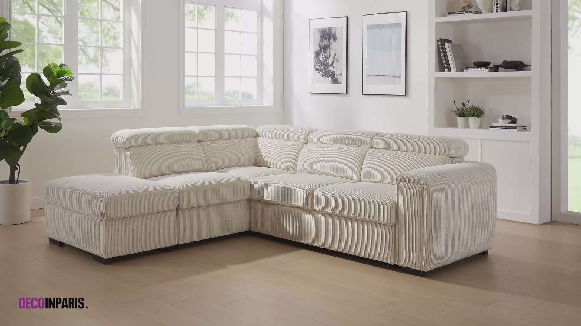 Aporte elegancia y practicidad a su salón con el sofá cama esquinero izquierdo convertible de 5 plazas ZENOVA, tapizado en pana gruesa color beige con otomana de almacenamiento.