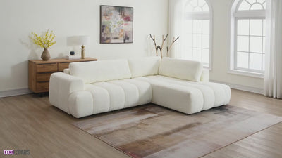 El sofá esquinero convertible HAVEN con almacenaje en tejido bouclé color crudo aportará un toque de confort y elegancia a tu salón gracias a su diseño limpio y sus asientos amplios y suaves, ofreciendo una experiencia de relajación única a la vez que realza tu interior.