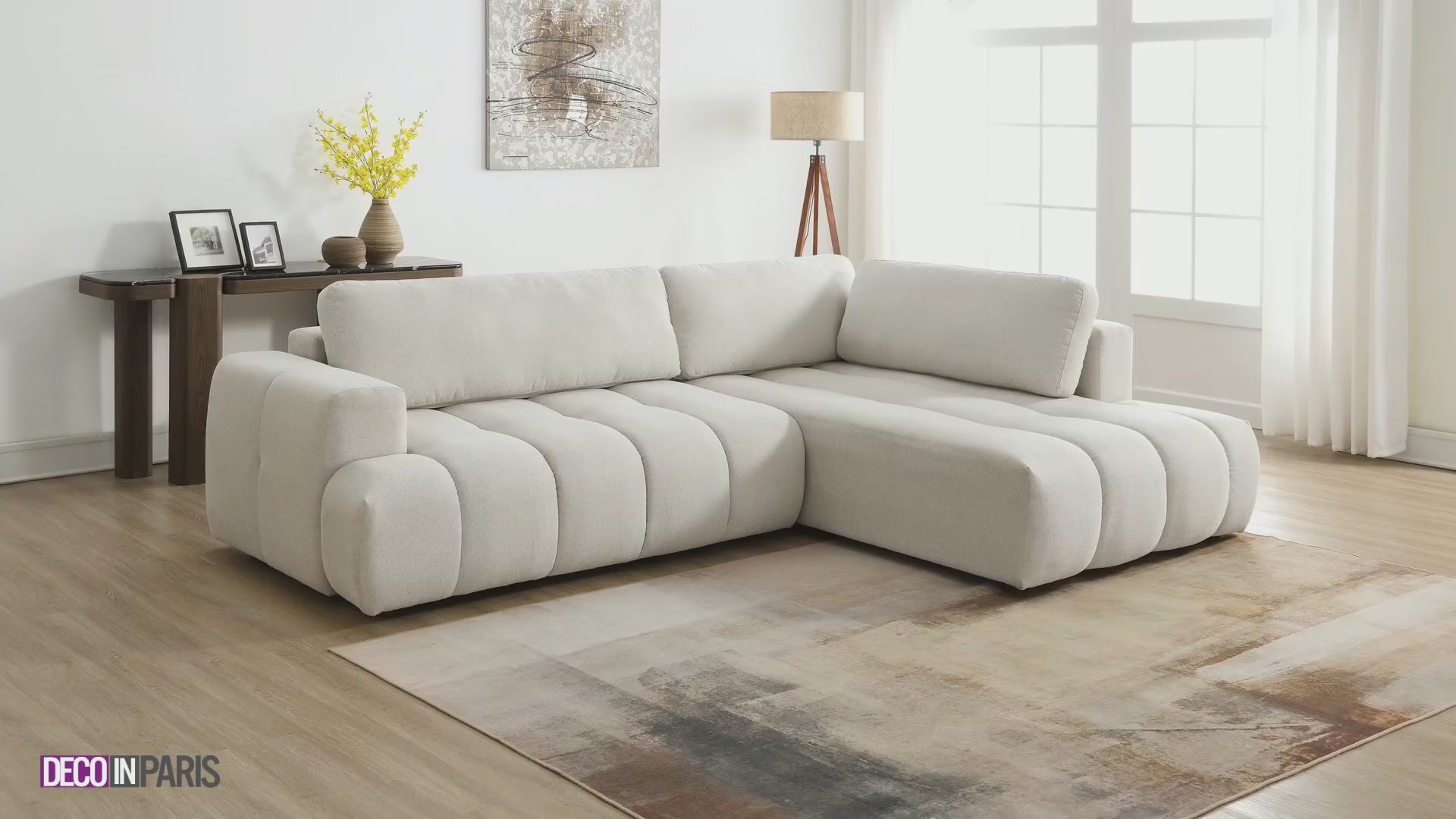 El sofá cama esquinero HAVEN, tapizado en tela color beige y con espacio de almacenamiento, aportará un toque de confort y elegancia a tu sala de estar. Su diseño minimalista y sus amplios y mullidos asientos ofrecen una experiencia de relajación única a la vez que realzan la decoración de tu hogar.