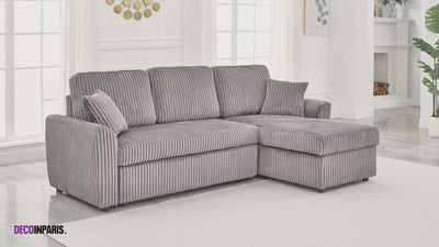 Descubre el sofá esquinero convertible y reversible ADRYEN en pana gris gruesa, una pieza central con un diseño limpio, perfecta para realzar tu sala de estar.