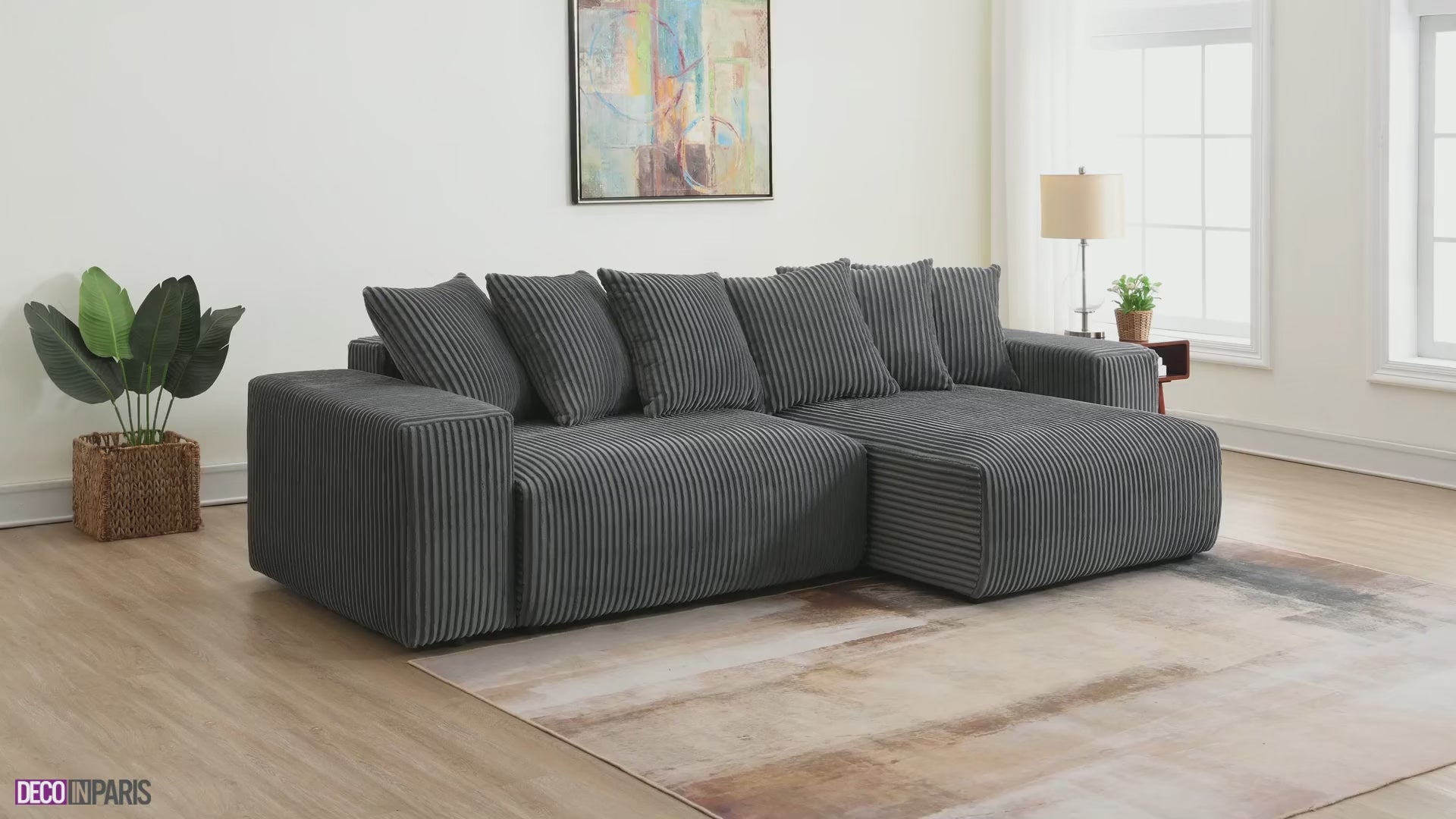 Descubre nuestro sofá esquinero convertible y reversible NOELIA con compartimento de almacenaje en pana gruesa gris.