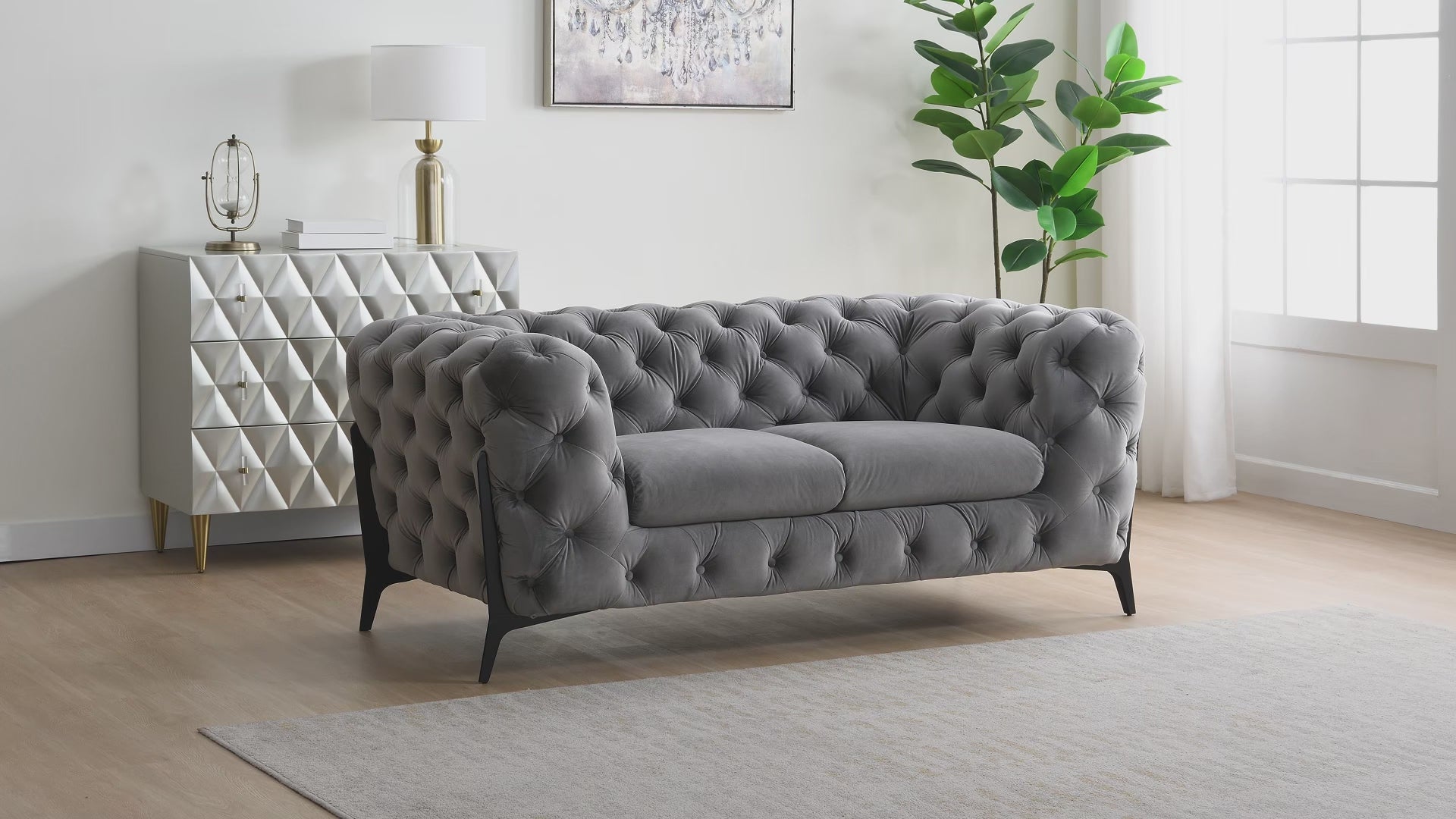 Sofá fijo CARMEN de 2 plazas estilo Chesterfield capitoné, terciopelo gris