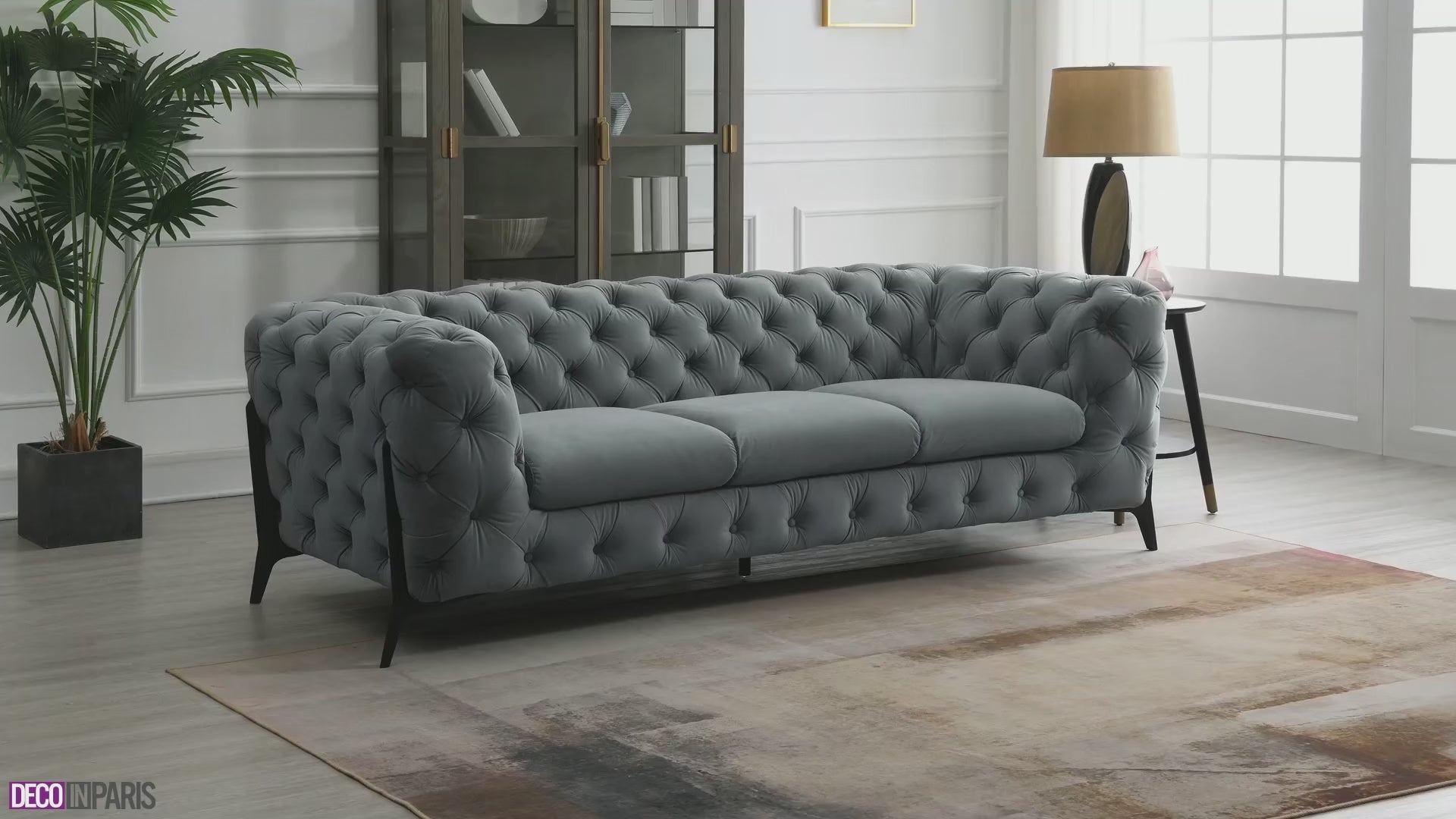 El sofá Chesterfield de 3 plazas CARMEN en terciopelo gris aportará un toque magnífico a su salón con su aspecto acogedor y elegante.