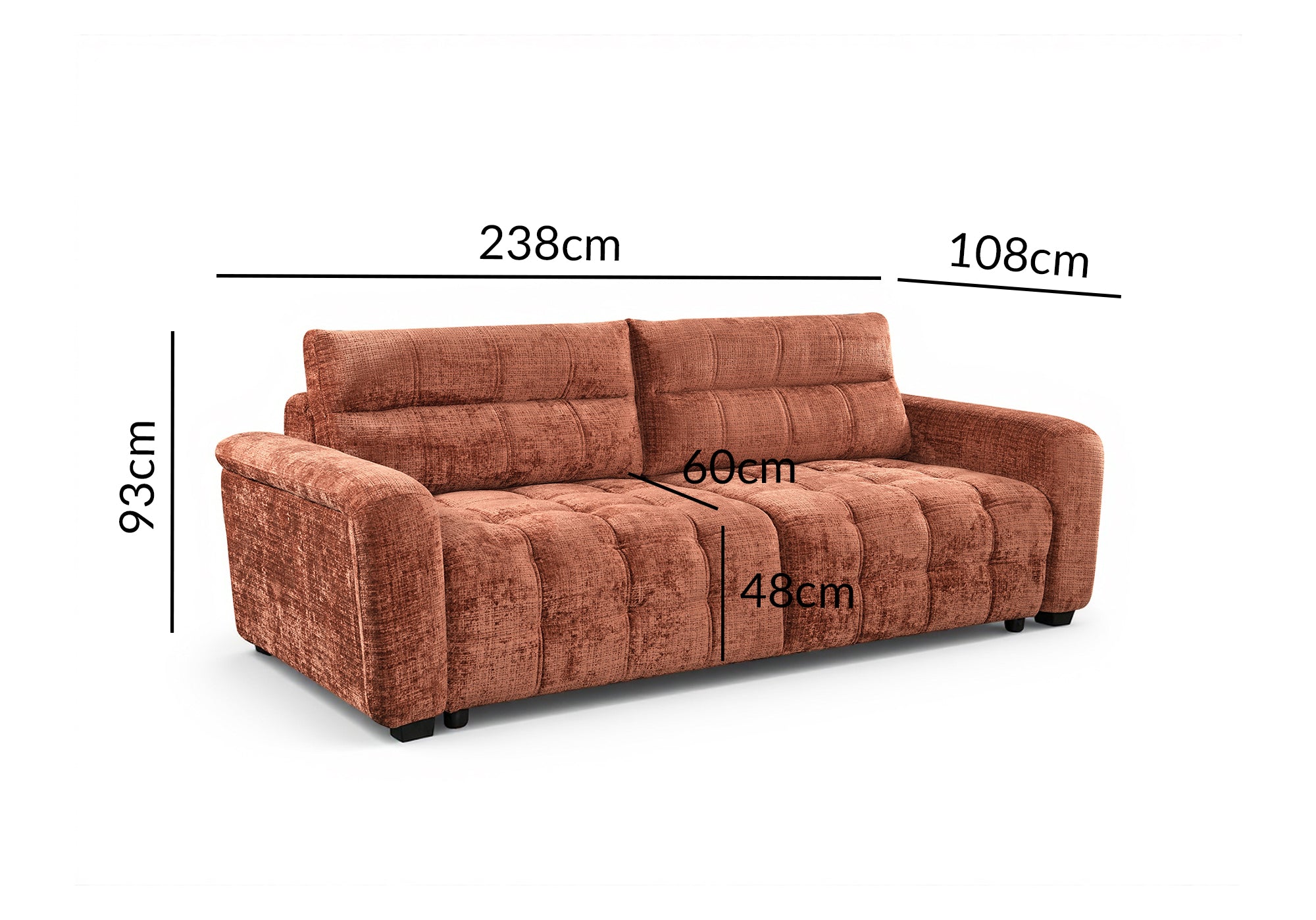 El sofá RALYA en terciopelo terracota combina comodidad, elegancia y funcionalidad en un tamaño generoso. Diseñado para tres personas , ofrece asientos amplios para el uso diario y se convierte fácilmente en cama gracias a su mecanismo convertible, ideal para alojar a familiares o amigos.