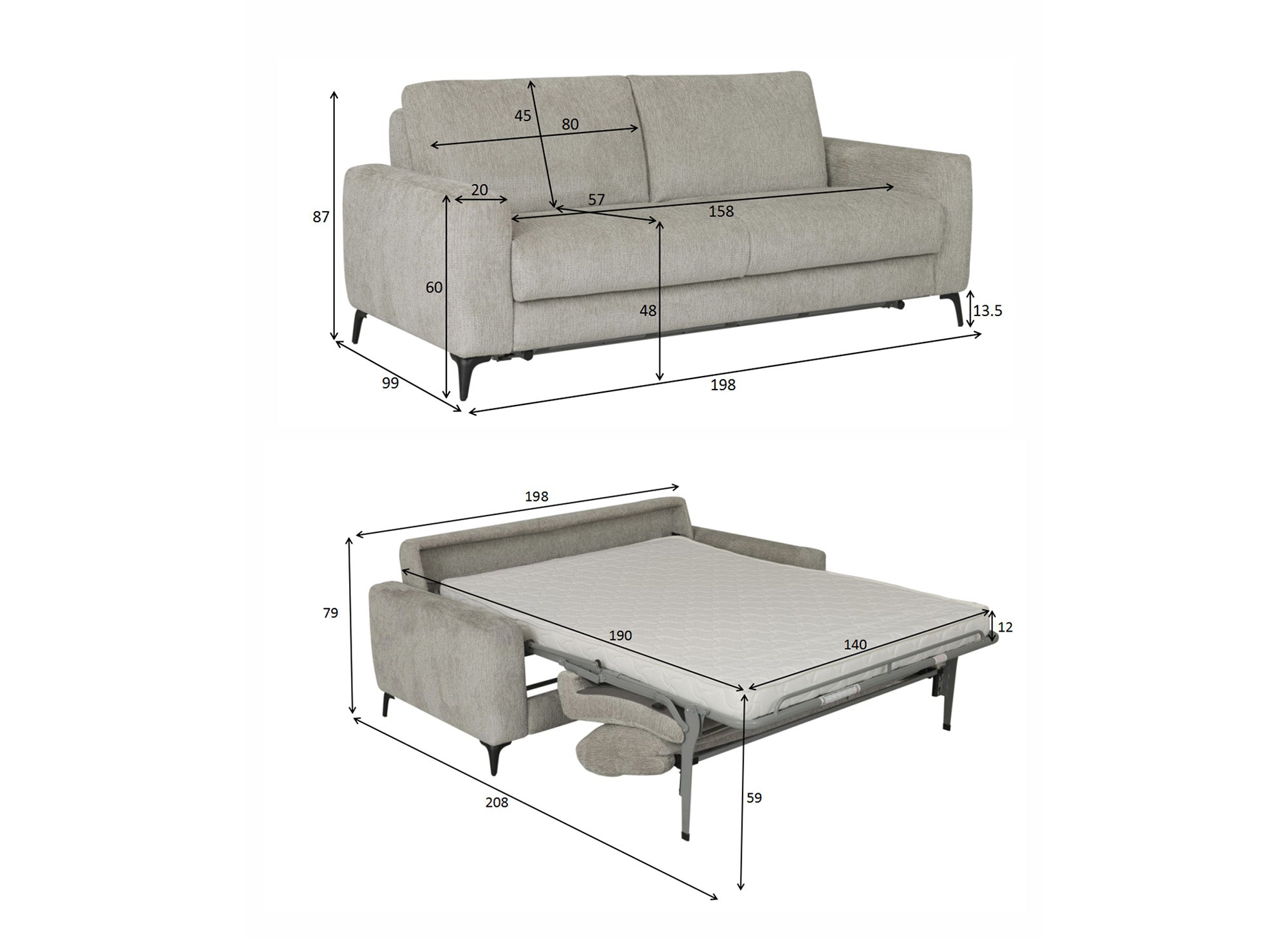 El sofá cama NONA es la combinación perfecta de elegancia moderna y funcionalidad para el día a día. Su diseño refinado, con líneas suaves y altas patas de metal negro, aporta un toque ligero y contemporáneo a tu hogar.