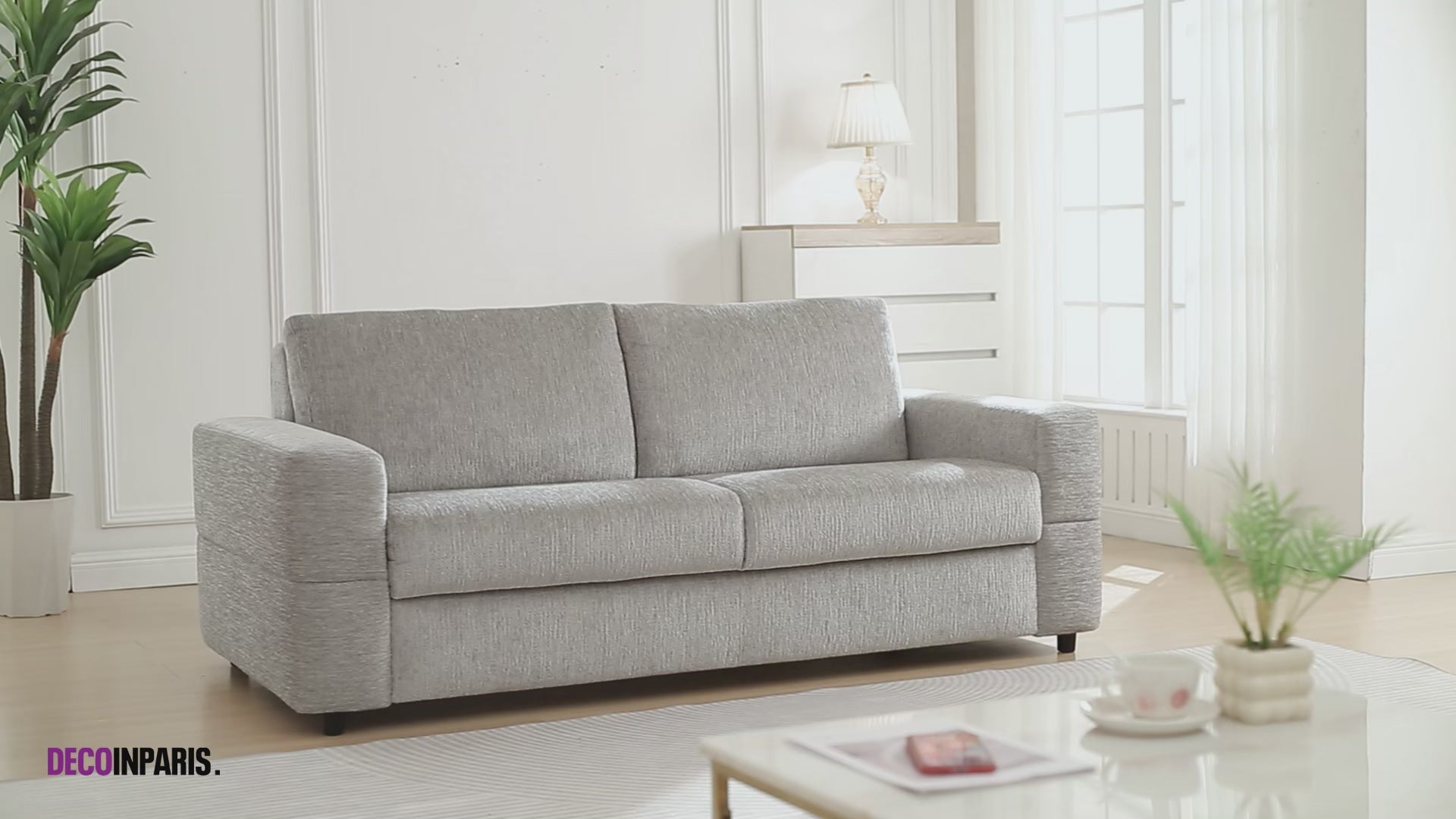 Sencillo, funcional y sumamente cómodo, el sofá cama AMAURY es una apuesta segura para cualquier interior que busque practicidad sin renunciar al estilo. Su diseño minimalista, sus generosas proporciones y su suave terciopelo jaspeado gris claro lo convierten en una pieza atemporal que se integra fácilmente en cualquier decoración.