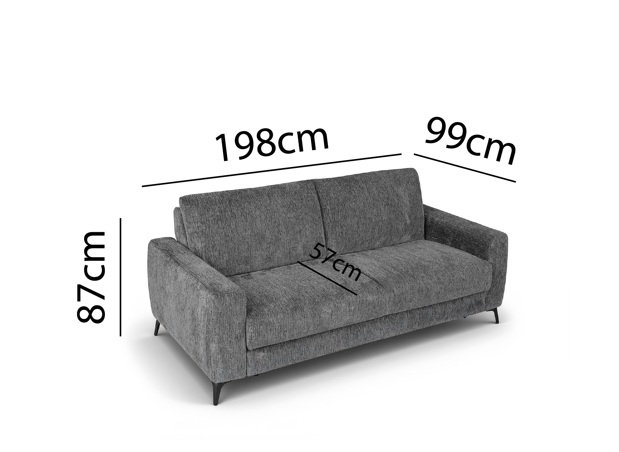 El sofá cama NONA es la combinación perfecta de elegancia moderna y funcionalidad para el día a día. Su diseño refinado, con líneas suaves y altas patas de metal negro, aporta un toque ligero y contemporáneo a tu hogar.