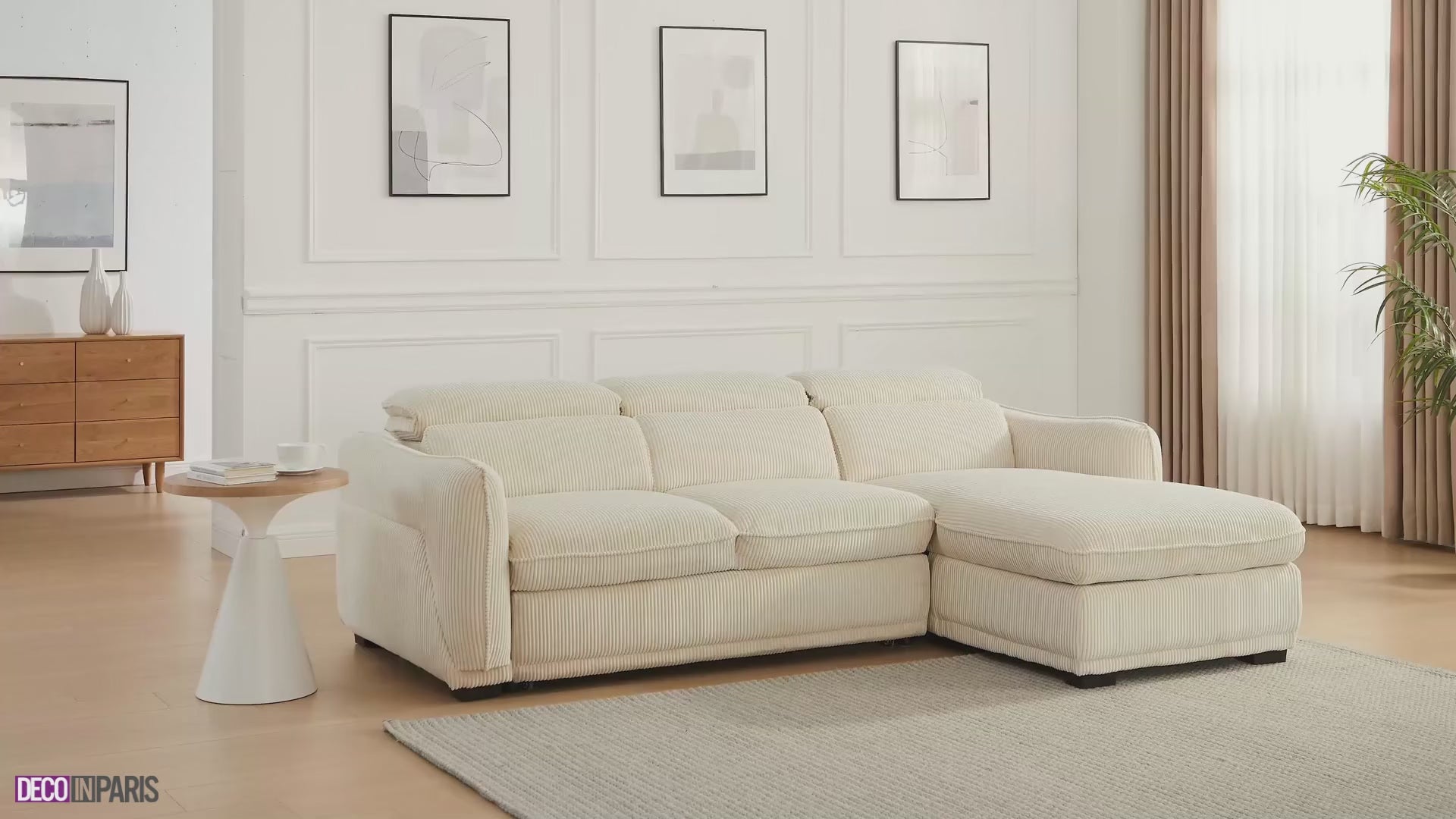 Enamórate del sofá cama esquinero derecho convertible PETUNIA en pana gruesa color beige , una combinación perfecta de elegancia y practicidad que aportará encanto y comodidad a tu sala de estar.