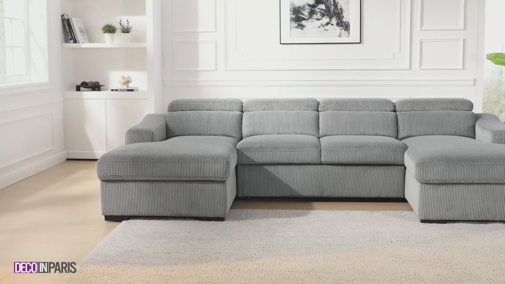 Descubre la elegancia y la practicidad combinadas en el sofá cama panorámico convertible en forma de U VELORA con almacenaje en pana gris gruesa.