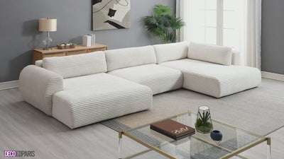 ¿Quieres darle a tu interior un toque acogedor pero elegante? Enamórate del sofá cama panorámico convertible en ángulo recto TILDA con almacenamiento en terciopelo de pana beige.