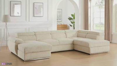 Sofá cama panorámico convertible MARIANO con almacenaje en pana gruesa color beige - Esquina izquierda