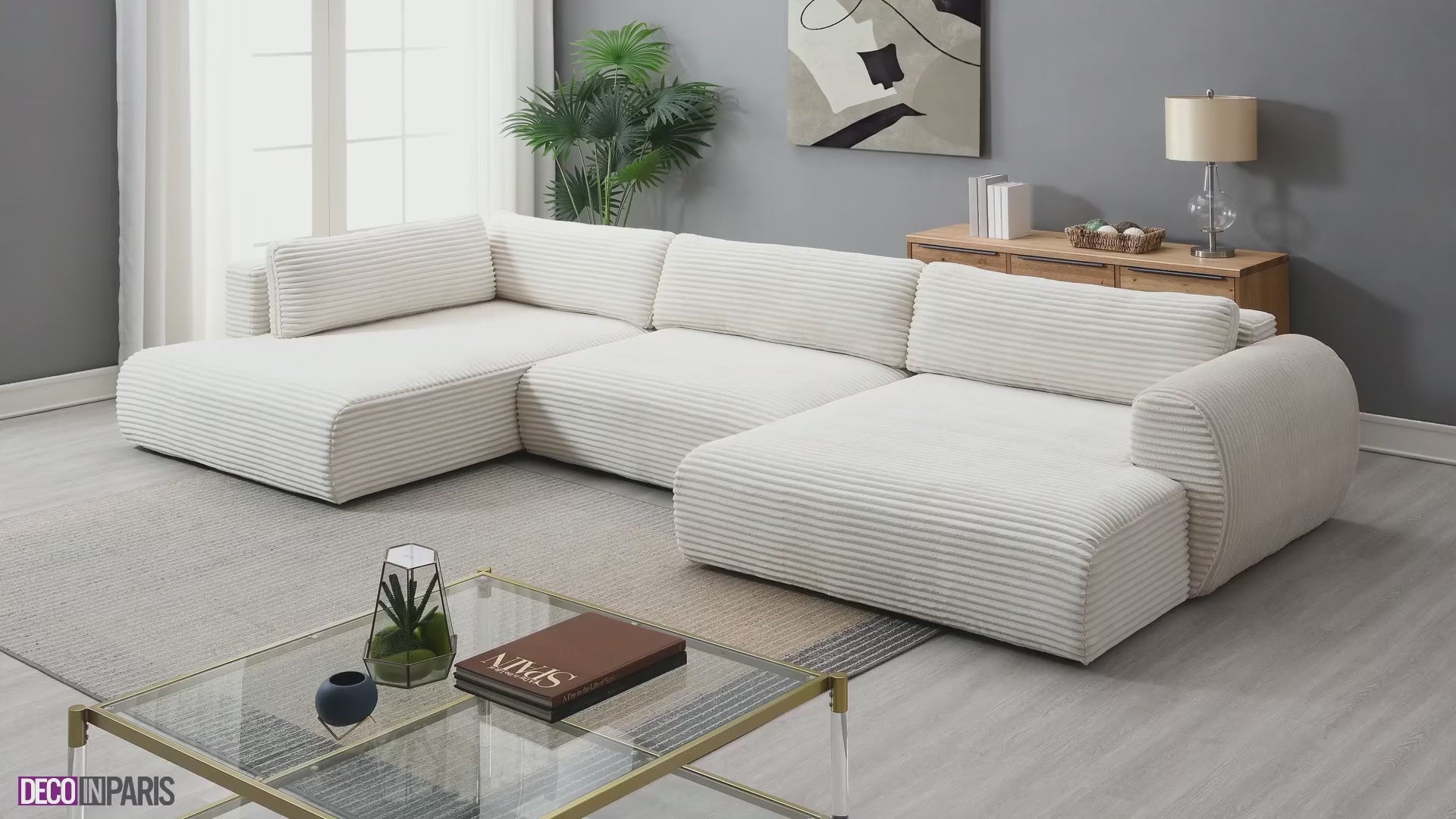 El sofá panorámico convertible TILDA en terciopelo de pana beige es la solución perfecta para crear un interior acogedor y elegante a la vez, combinando comodidad, estilo y funcionalidad.