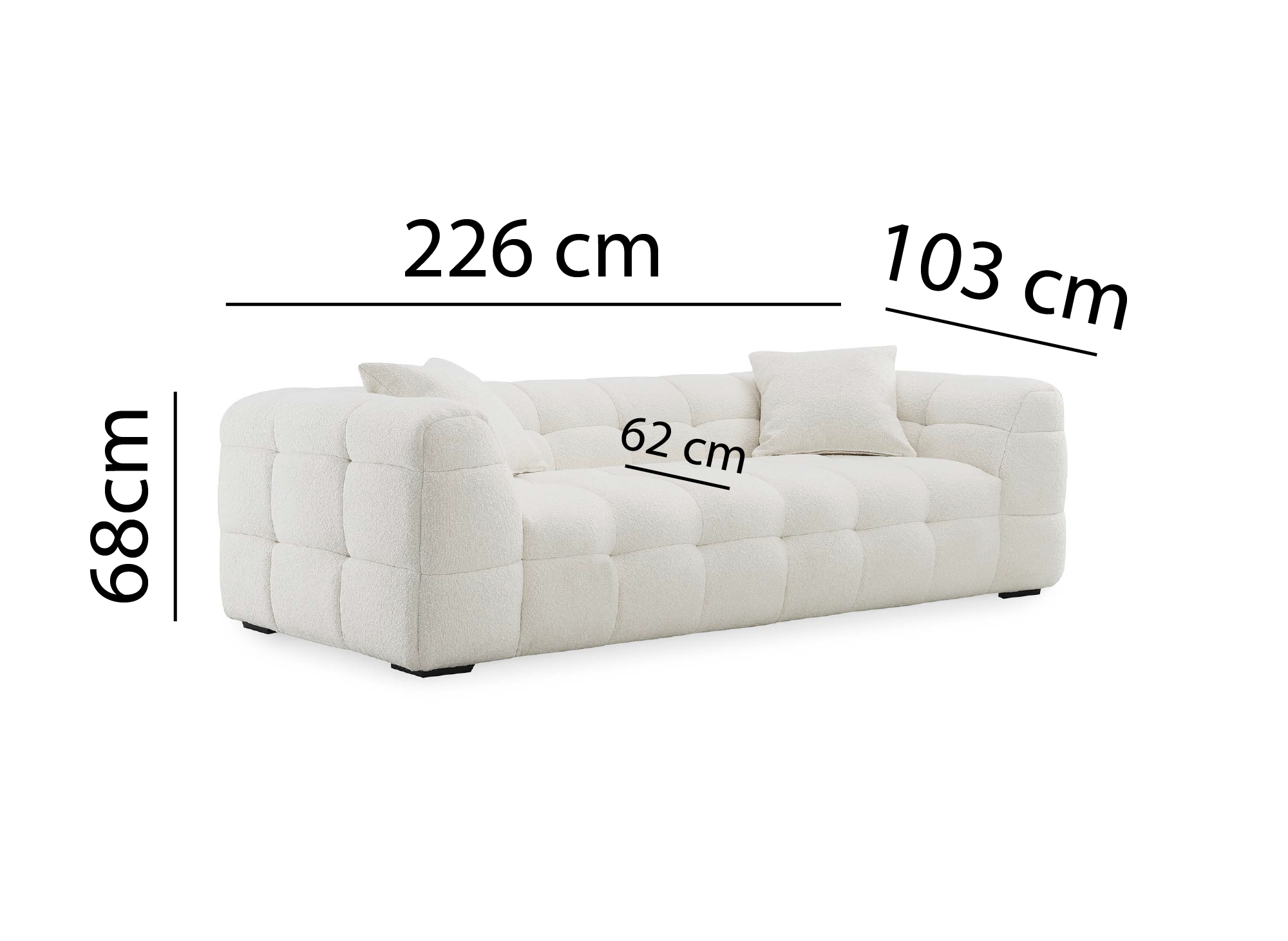 Dimensiones: Ancho 226 cm x Profundidad 103 cm x Altura 70 cm / Altura del asiento: 42 cm / Altura de las patas: 3 cm