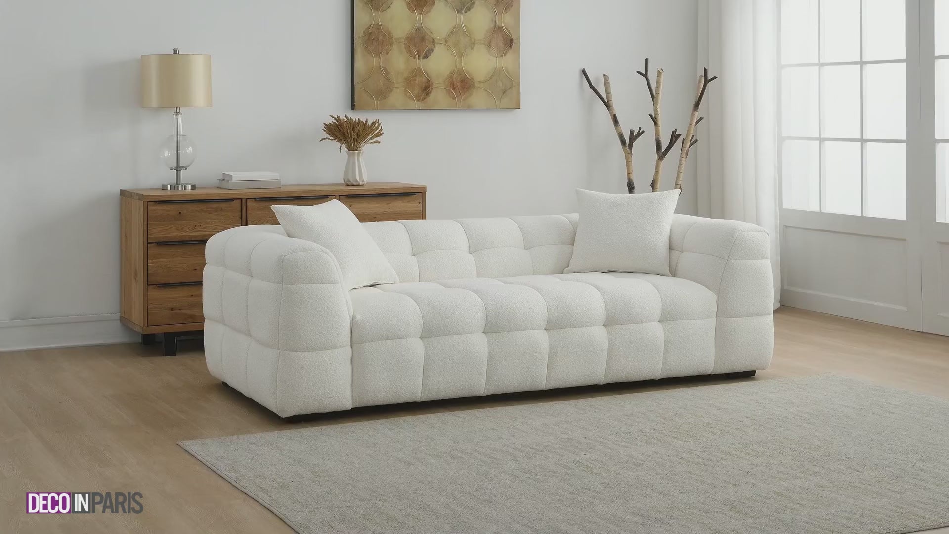 Sofá fijo BELLA de 3 plazas en efecto piel de oveja color blanco roto