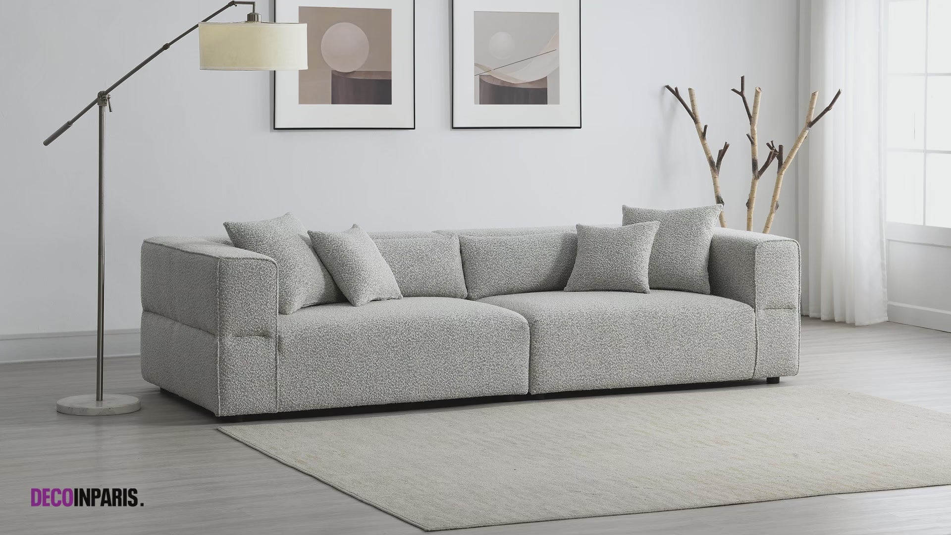 Elige el sofá EVELYNE de 4 plazas con efecto piel de oveja gris para crear un espacio relajante y acogedor. Disponible en varios colores.