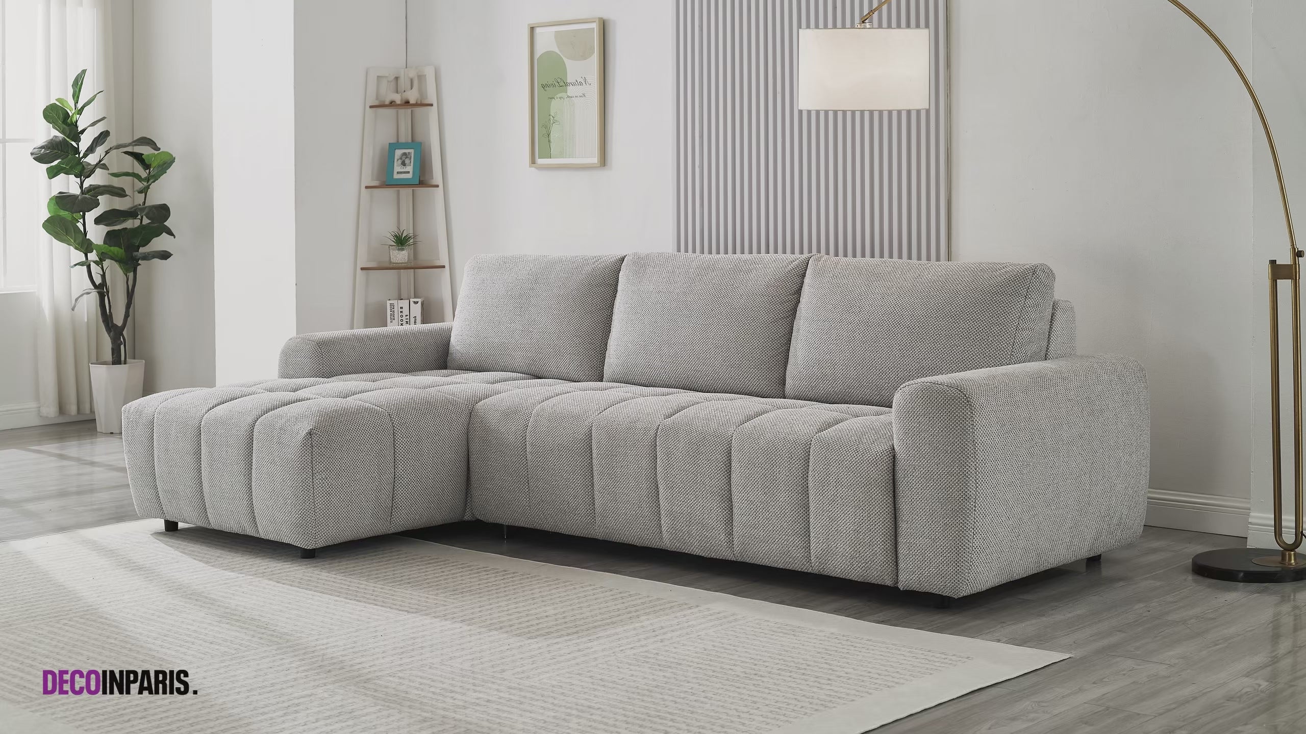 Sofá esquinero convertible con apertura exprés en tejido gris AGATHE – ángulo izquierdo