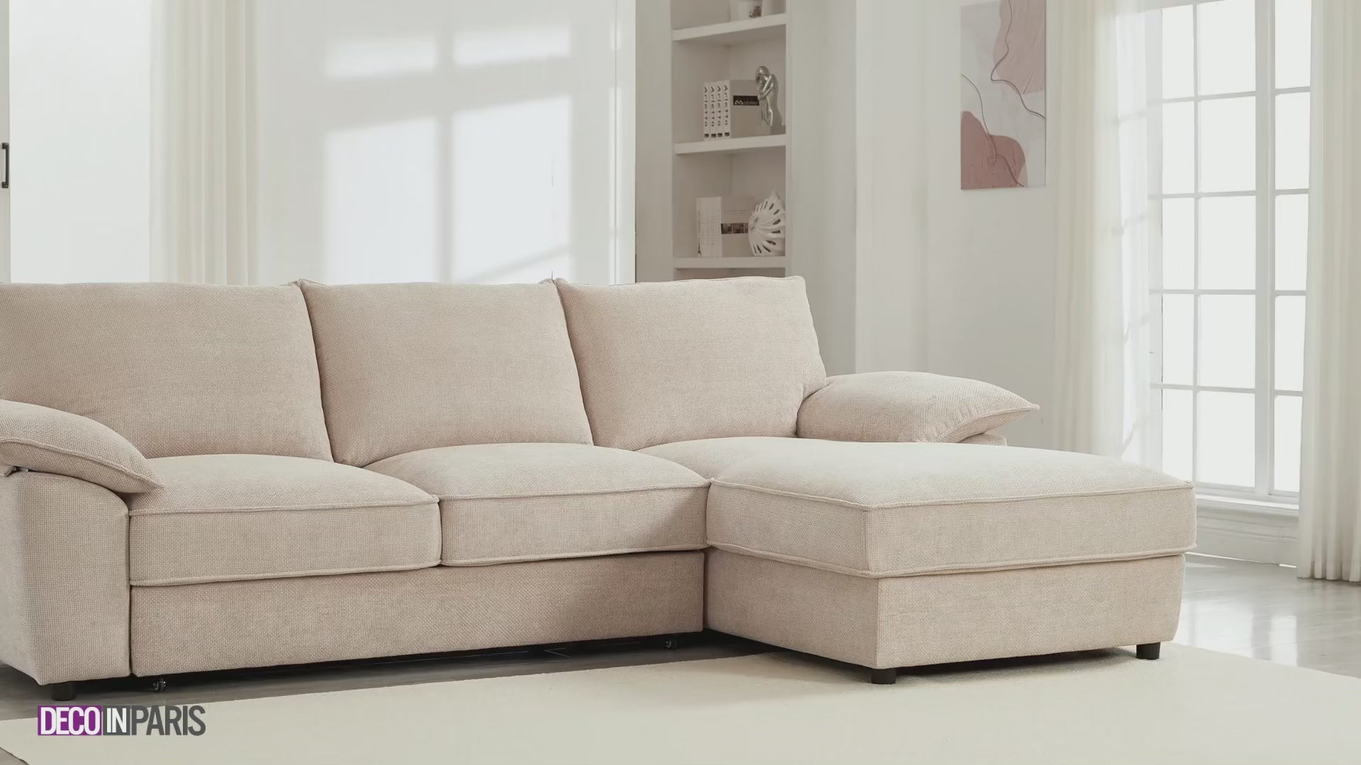 Aporte un toque de modernidad a su sala de estar con este sofá esquinero convertible con arcón de almacenamiento en terciopelo jaspeado beige GABIN - esquina derecha .
