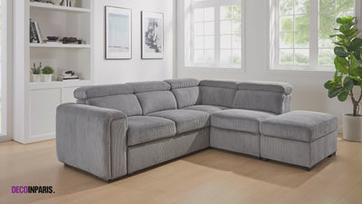 Aporte elegancia y practicidad a su salón con el sofá cama esquinero derecho convertible de 5 plazas ZENOVA, tapizado en pana gris gruesa con otomana de almacenaje.