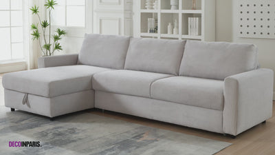Sofá esquinero convertible y reversible JULIETTE con apertura exprés en terciopelo gris jaspeado